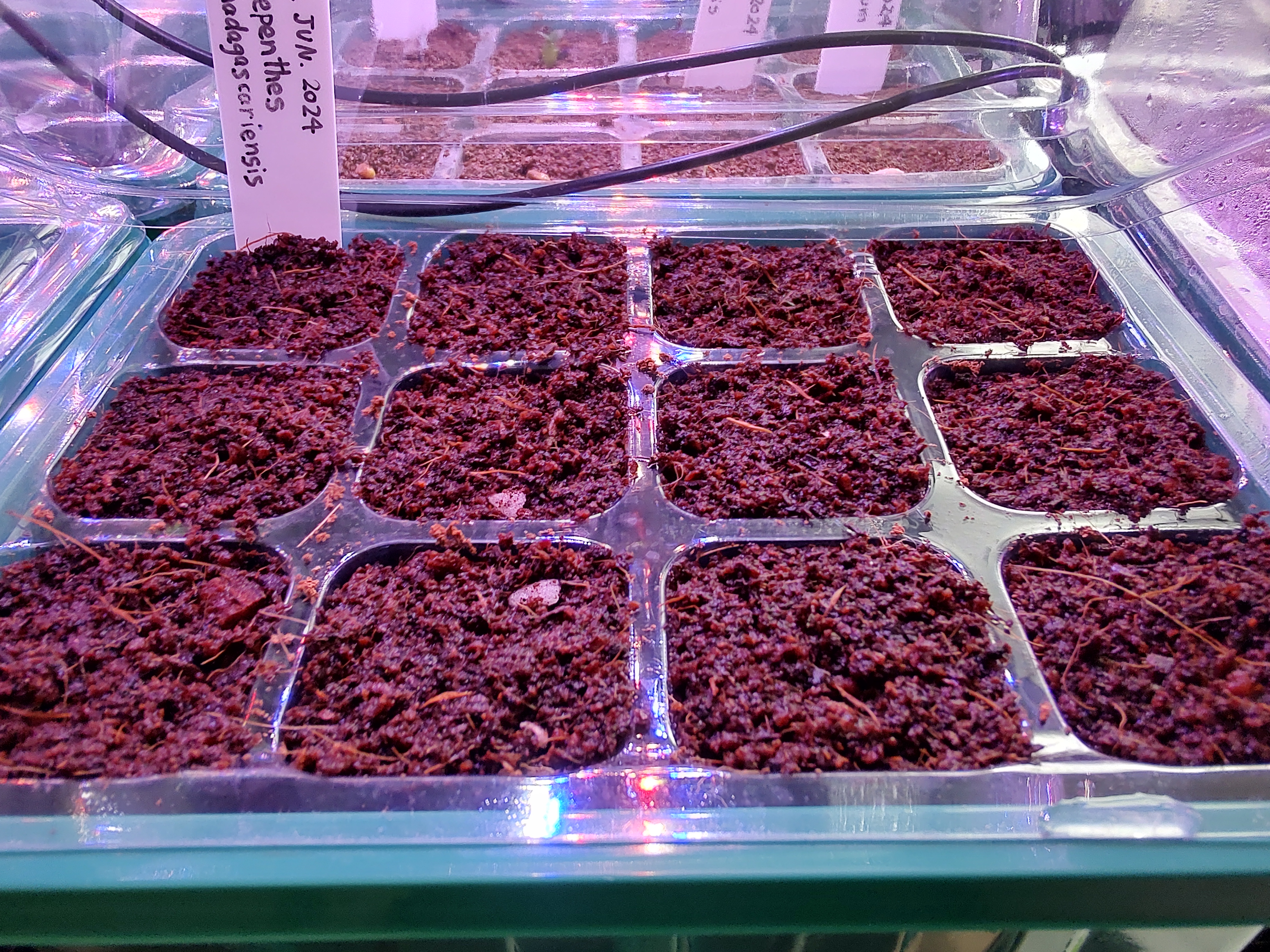 ダイソーのかる~い観葉植物の土(ココヤシピート ハスクチップ パーライト)で播種、25度〜28度でLEDポッドで管理