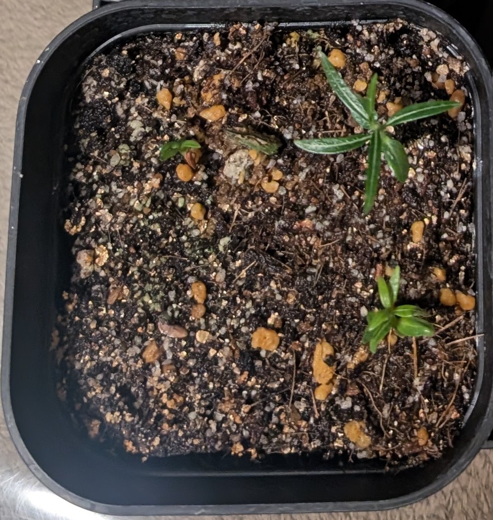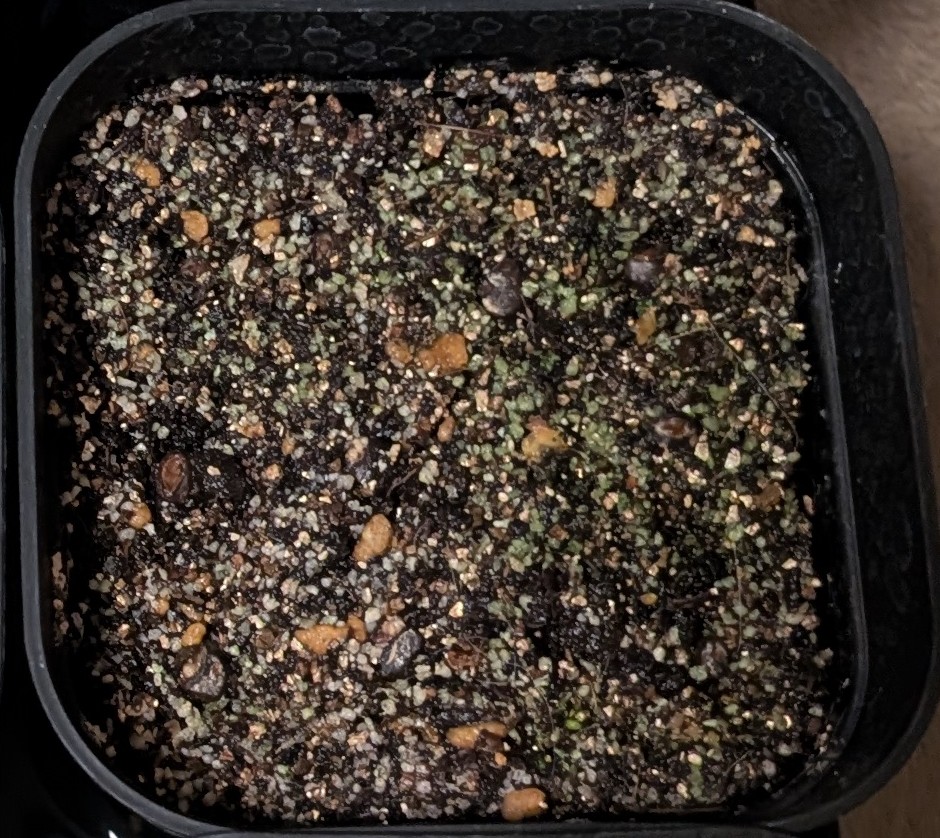2025年8月播種、赤玉細粒オンリーの腰水に蓋をかぶせて屋外の日陰で管理。ベンレートが手元になかった...