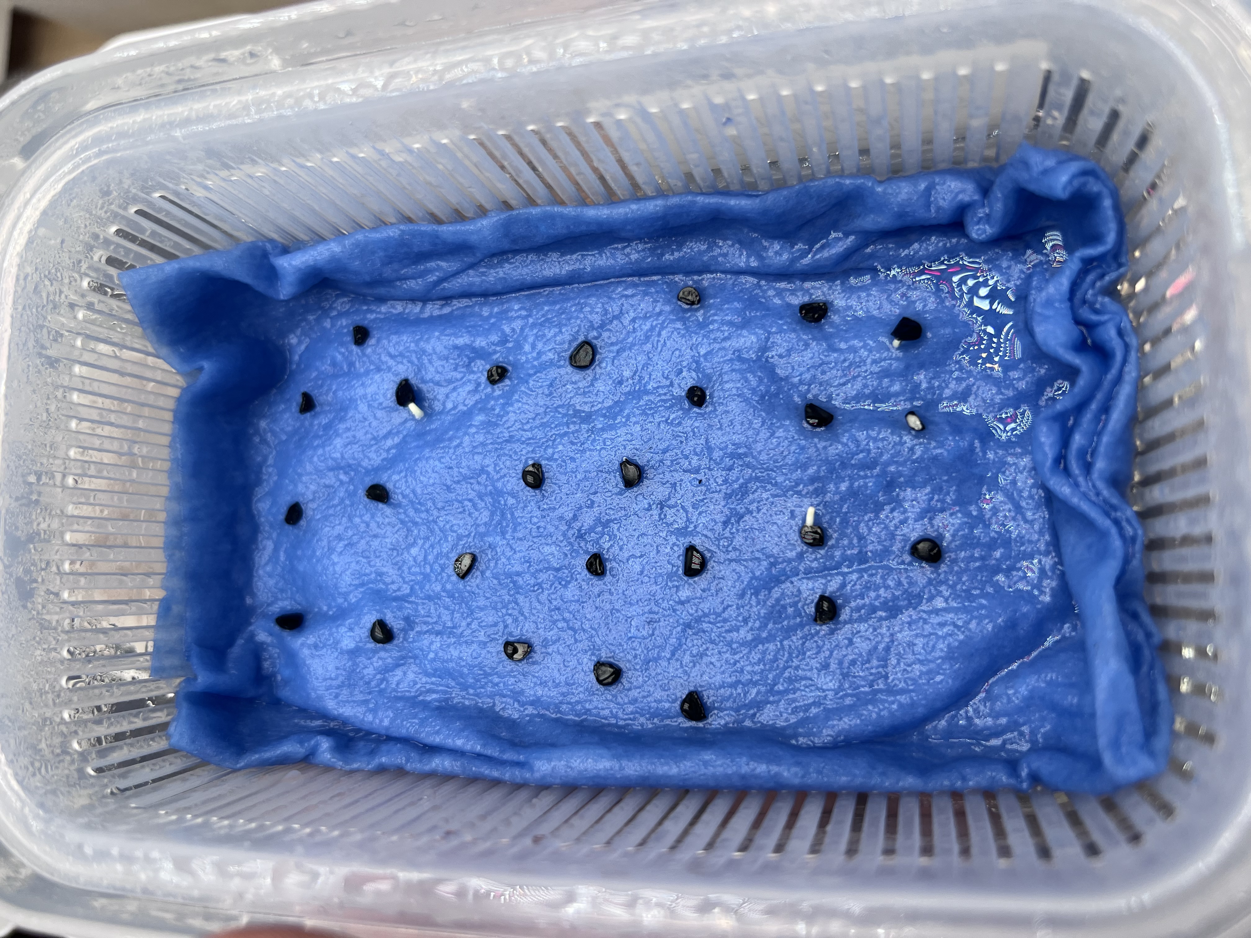 • 2024/10/12現在 二週間前に播種37粒/ 50粒発芽容器はザル付きタッパー 蓋に穴を開けたも...