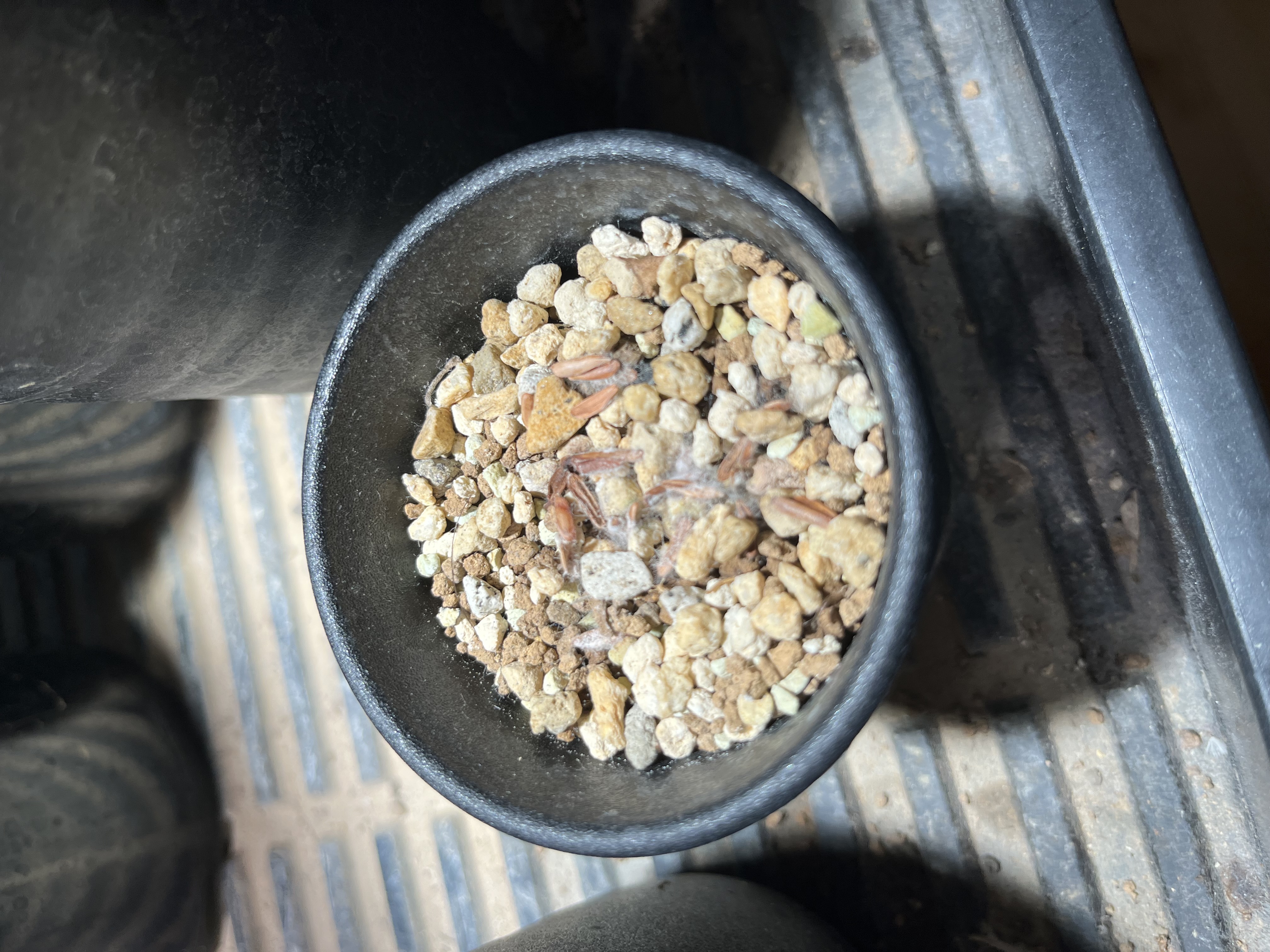 2023.8.28播種2024.8.20撮影6粒/3発芽 1つ落ちて2つ残り細長い根が鉢底からすぐで...
