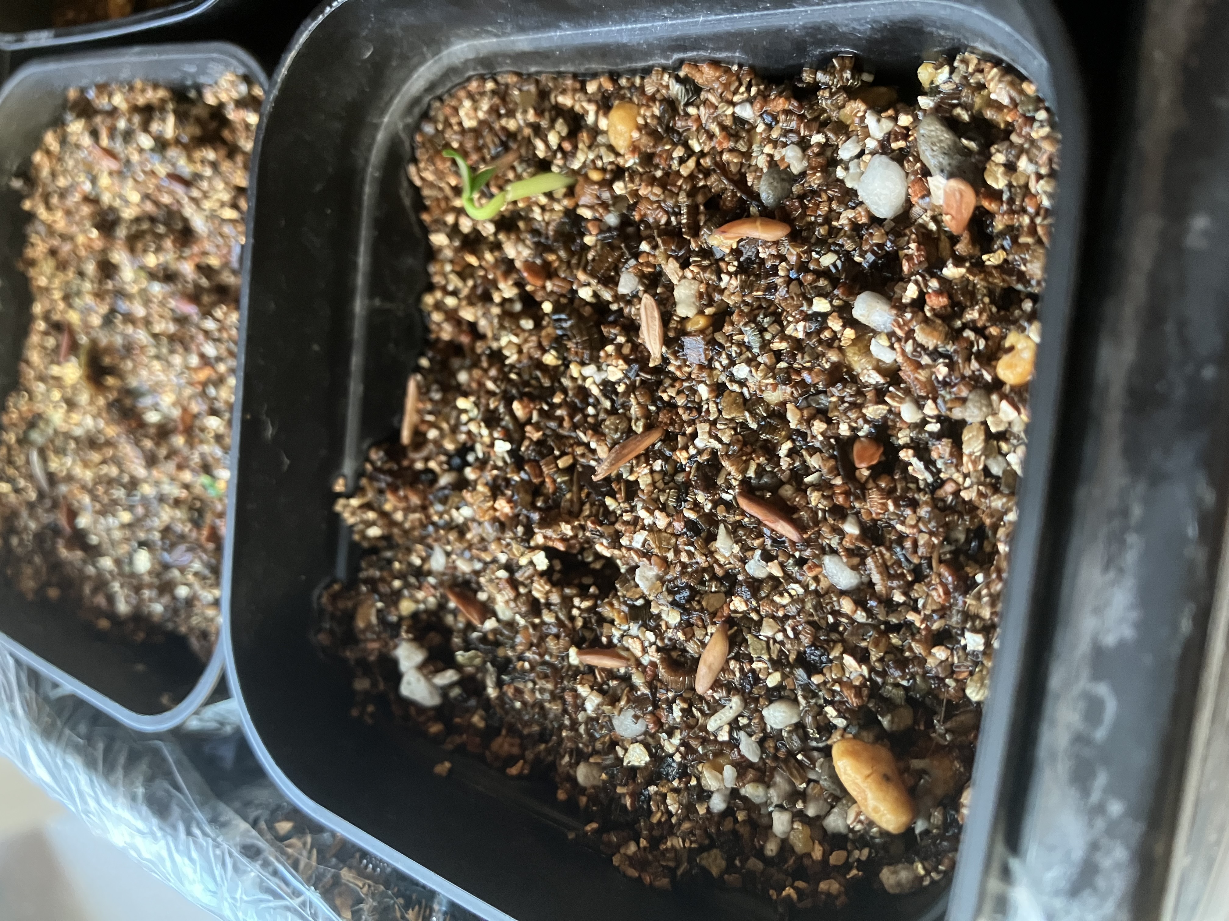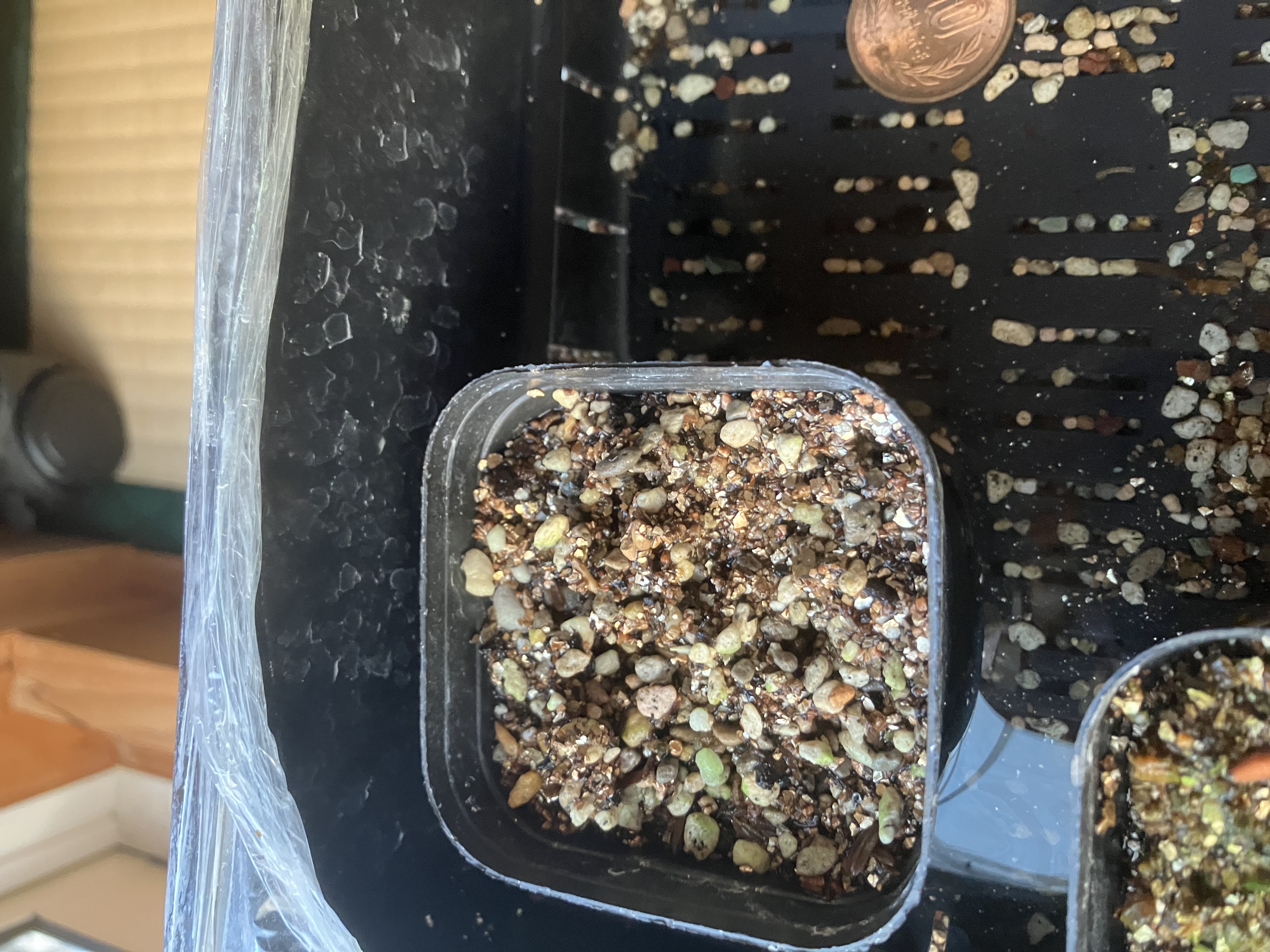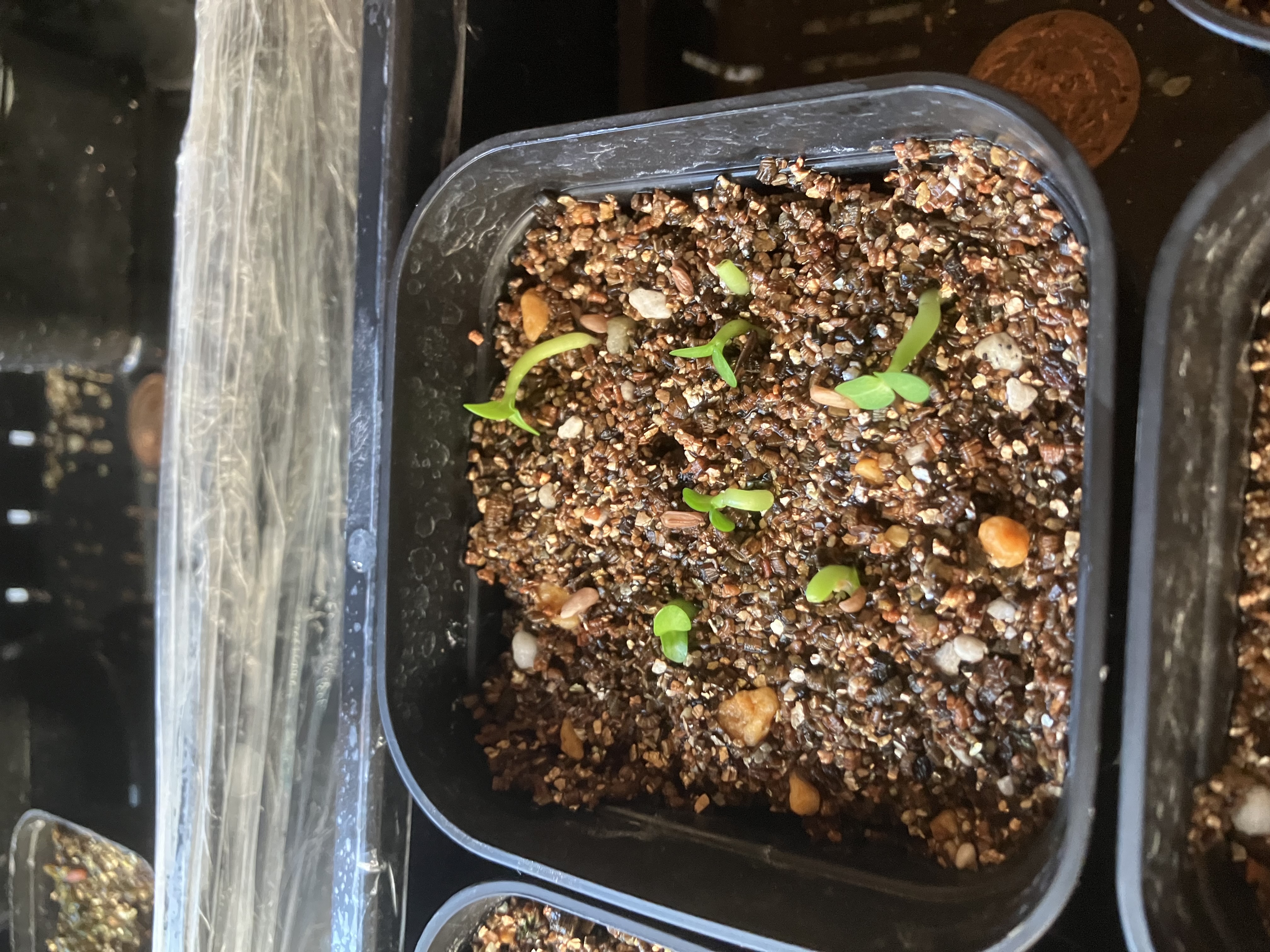 オーソサイドとメネデール希釈液に1晩浸し、種まき用土に覆土無しで6粒播種腰水を切らさず常温で、少しだ...