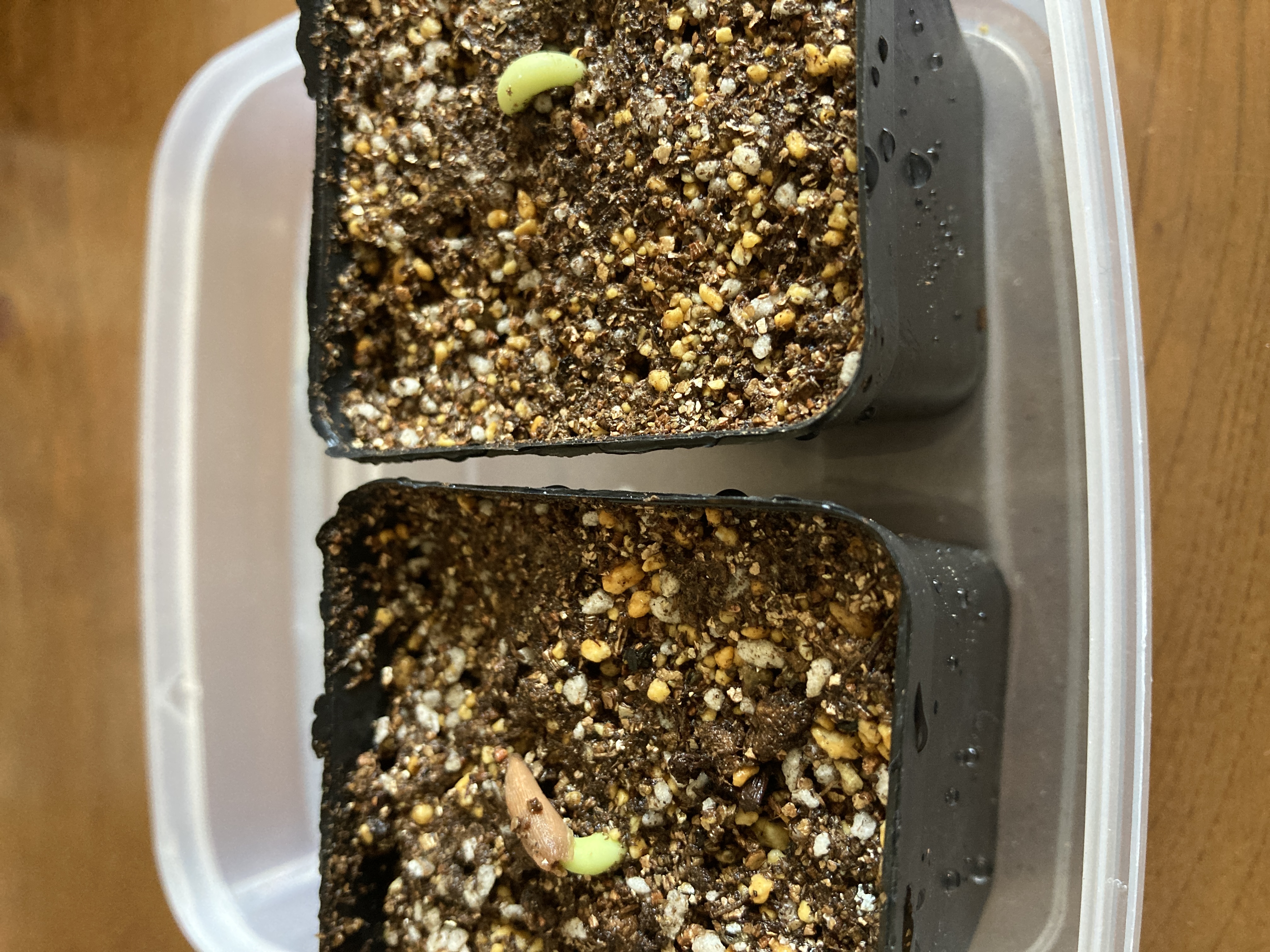 2024/5/4播種、5/8撮影6粒中6粒発芽確認細く尖った方を少しカットしたあとにベンレート200...