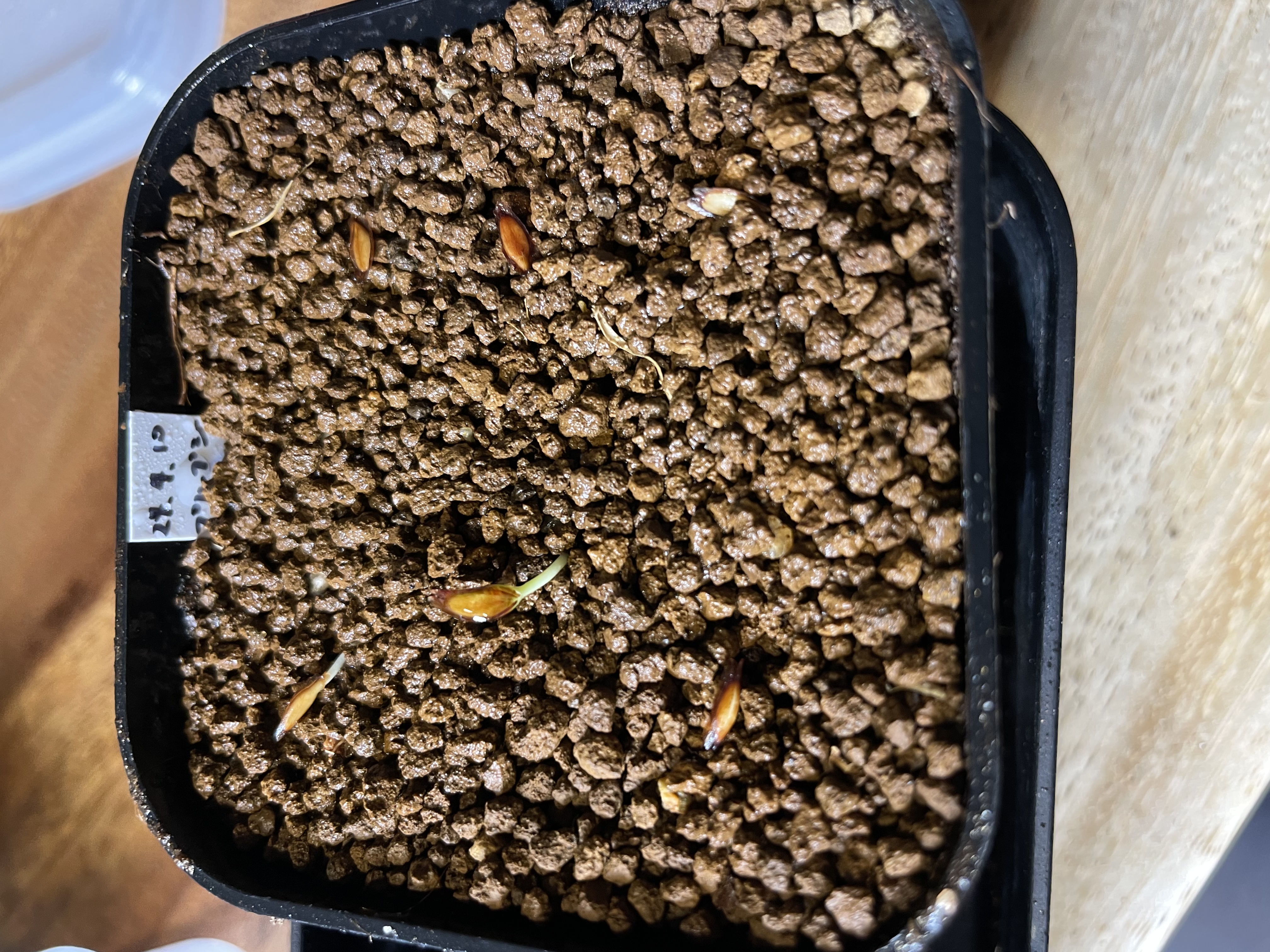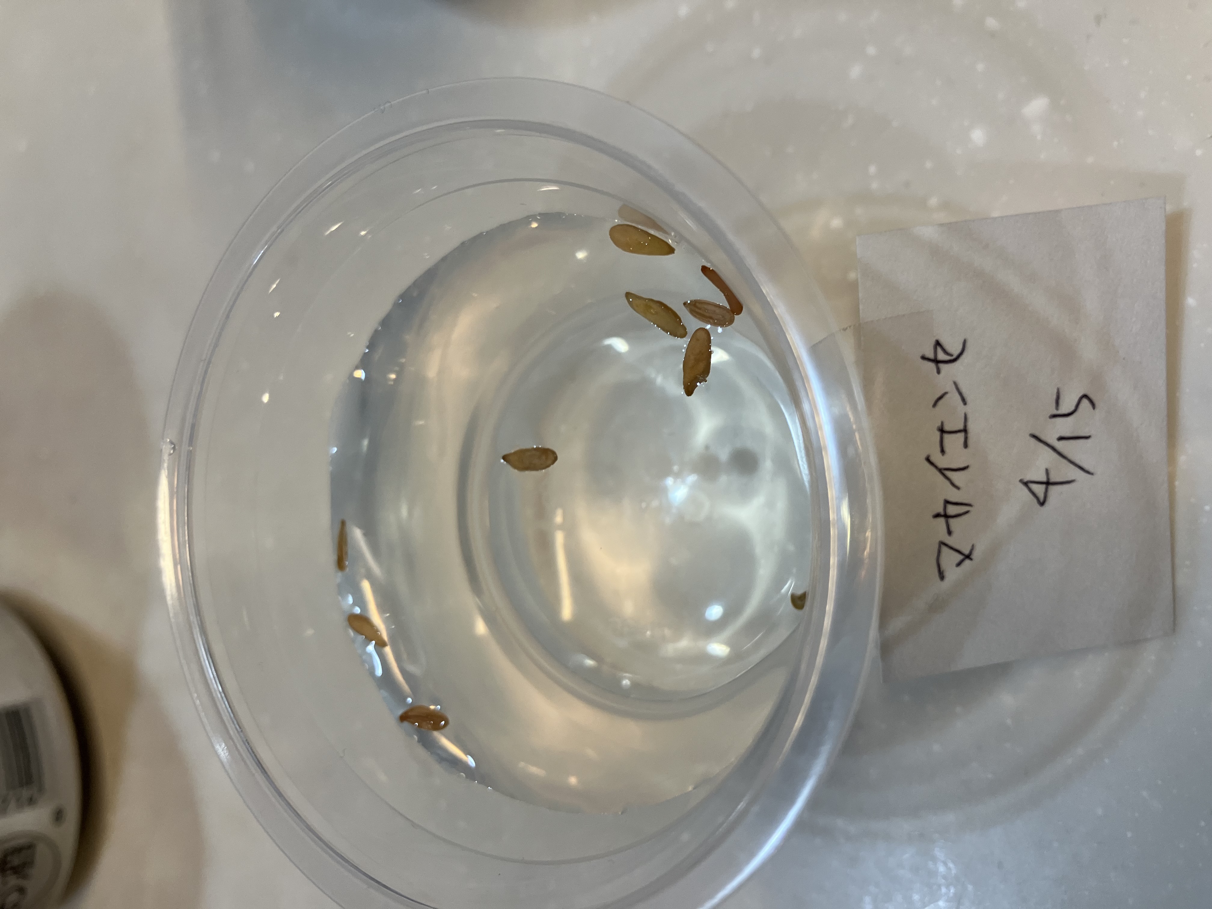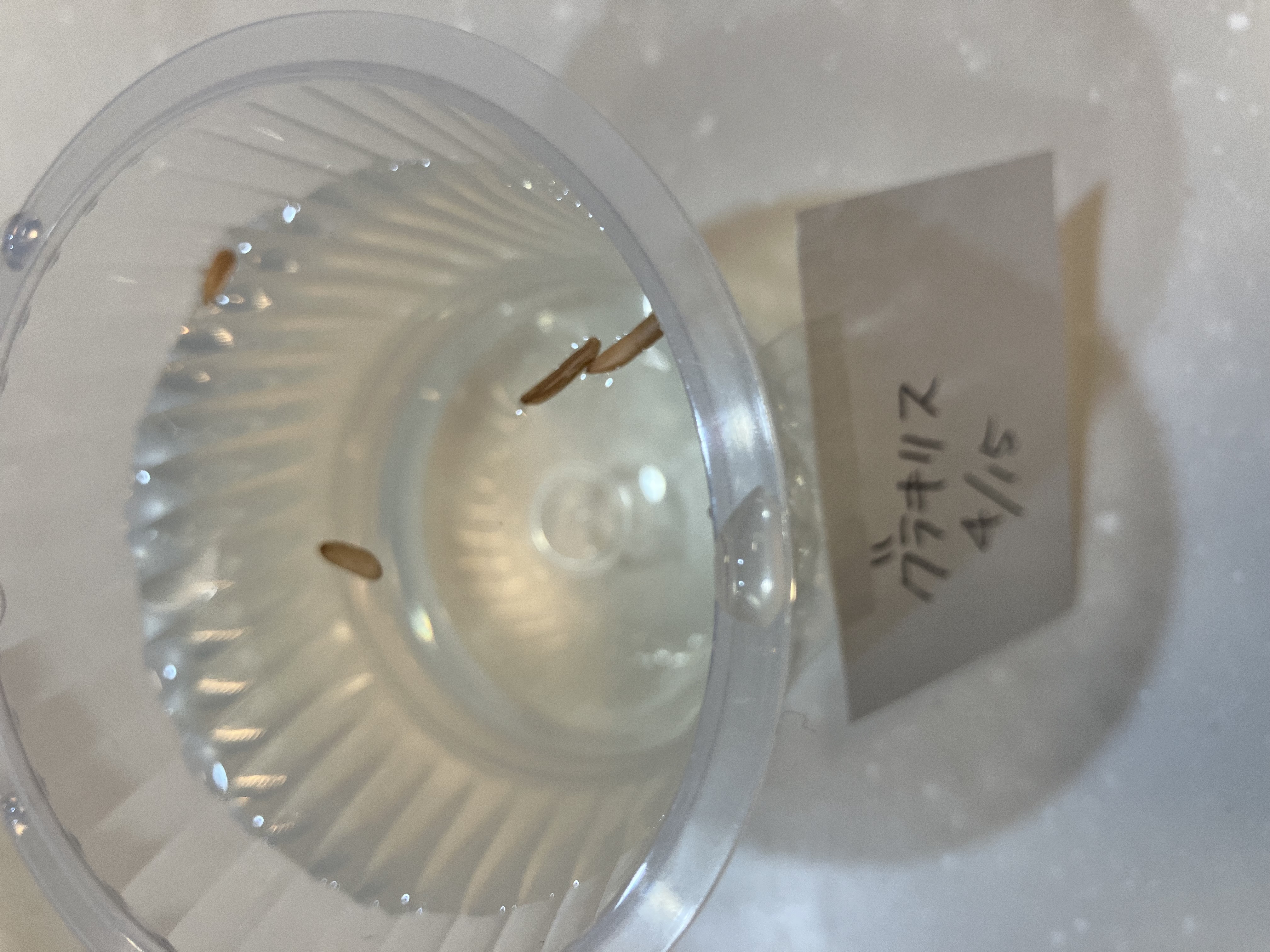 • 2024/4/15 播種。2024/4/15 撮影。メネデールに4時間浸漬。腰水管理開始。さし芽土使...