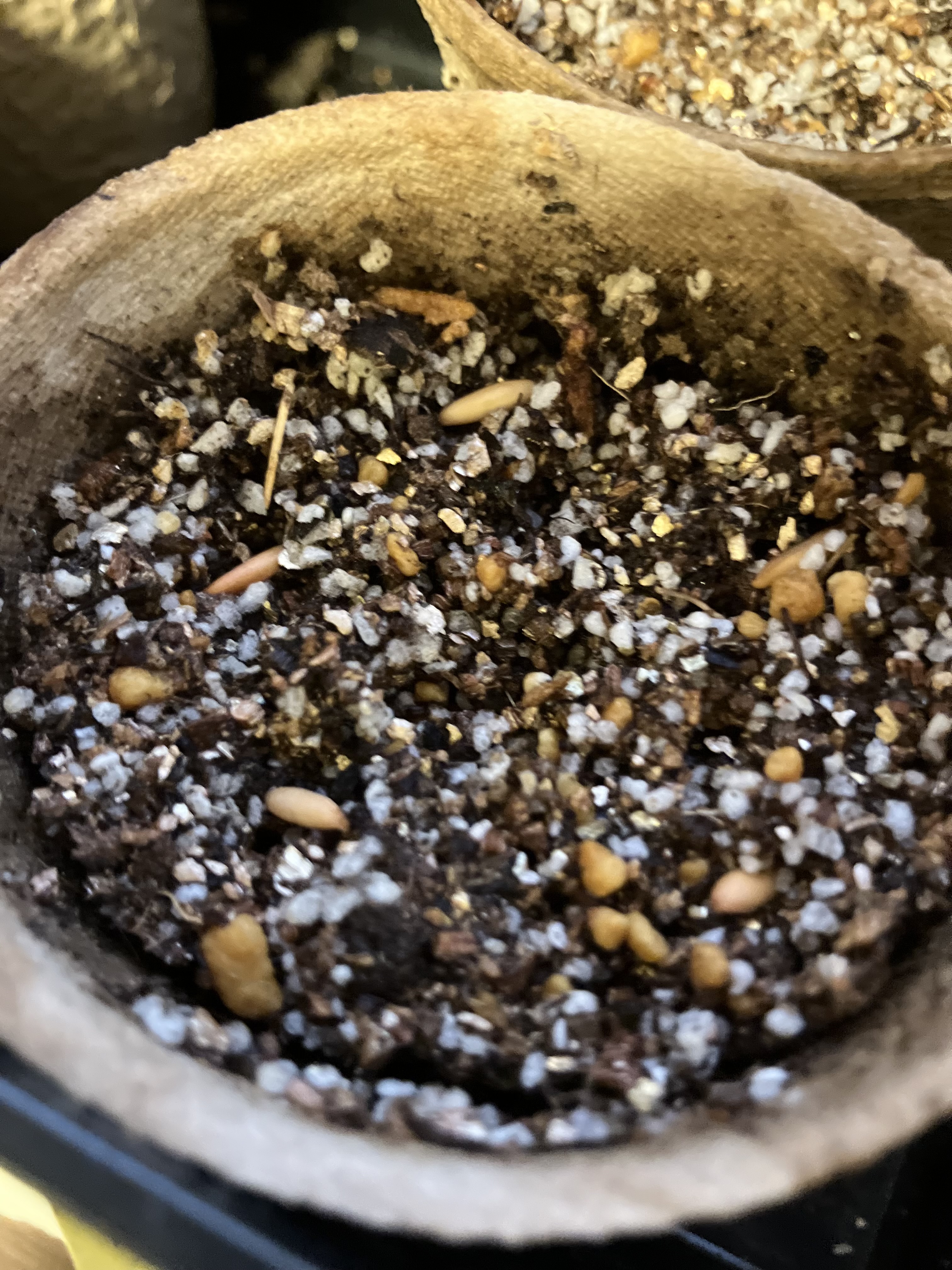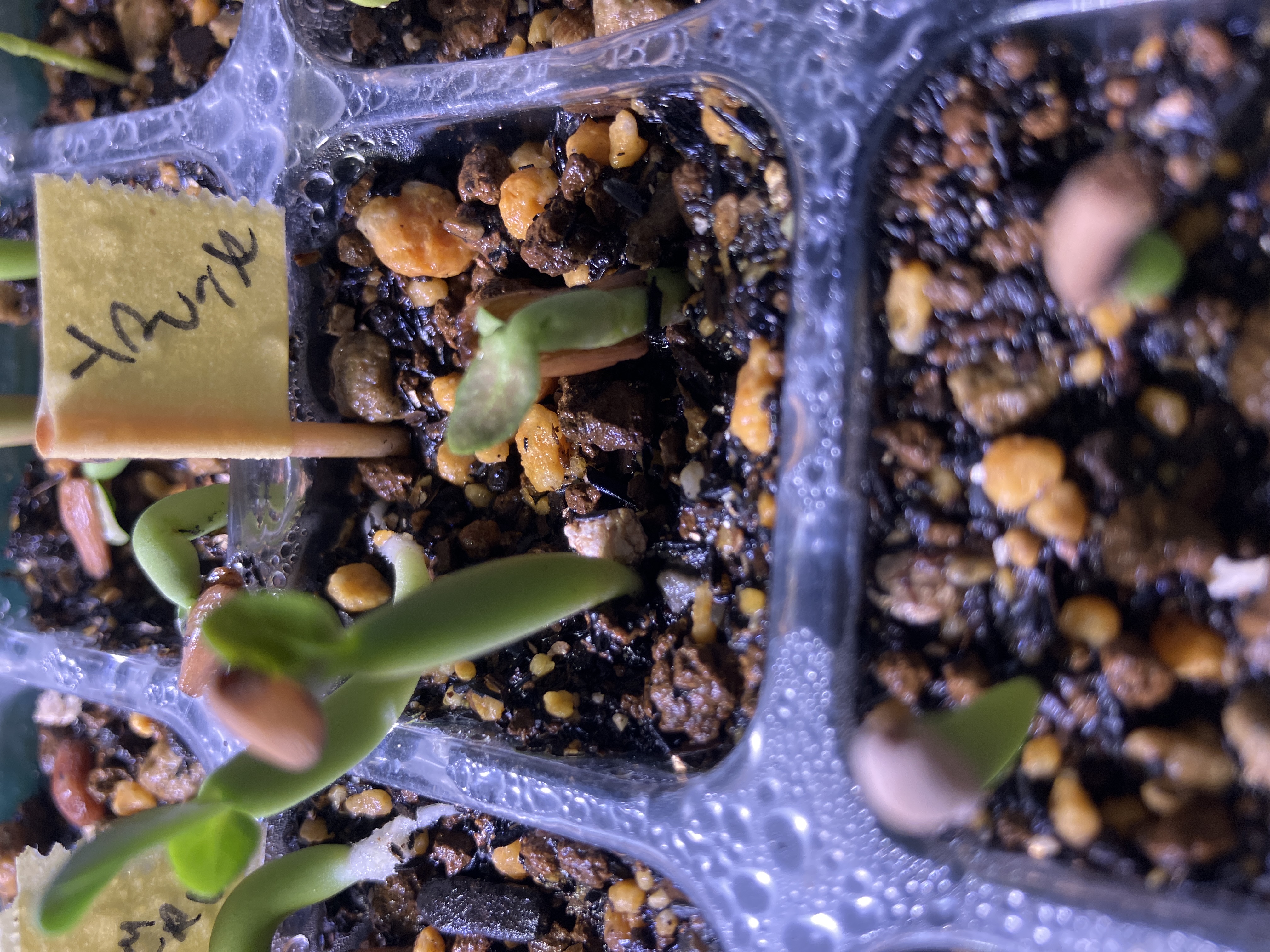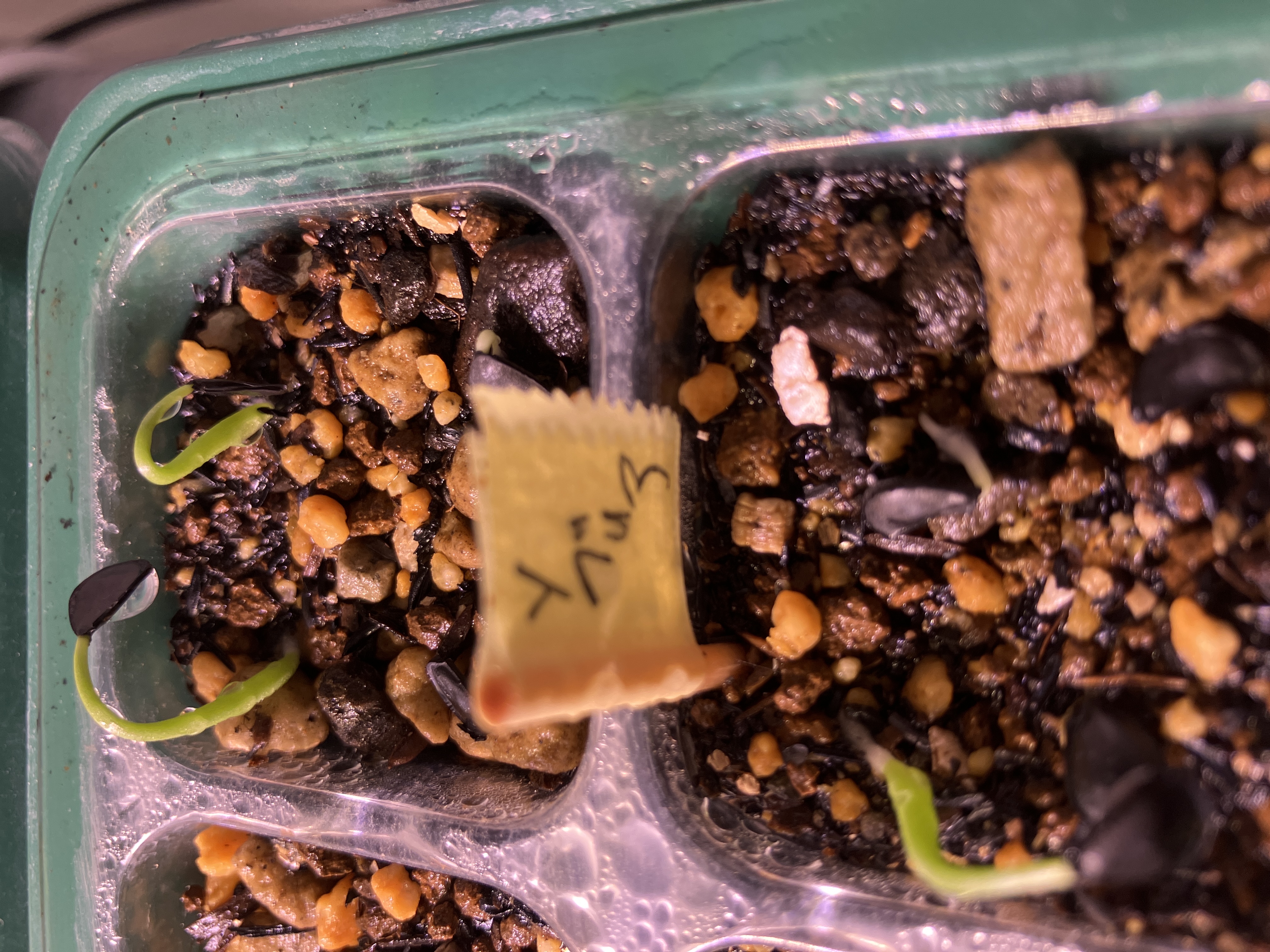 • 2024.4/4播種4/7撮影5粒/4粒発芽播種前ベンレート溶液に1日浸漬小粒赤玉を下、バーミキュラ...