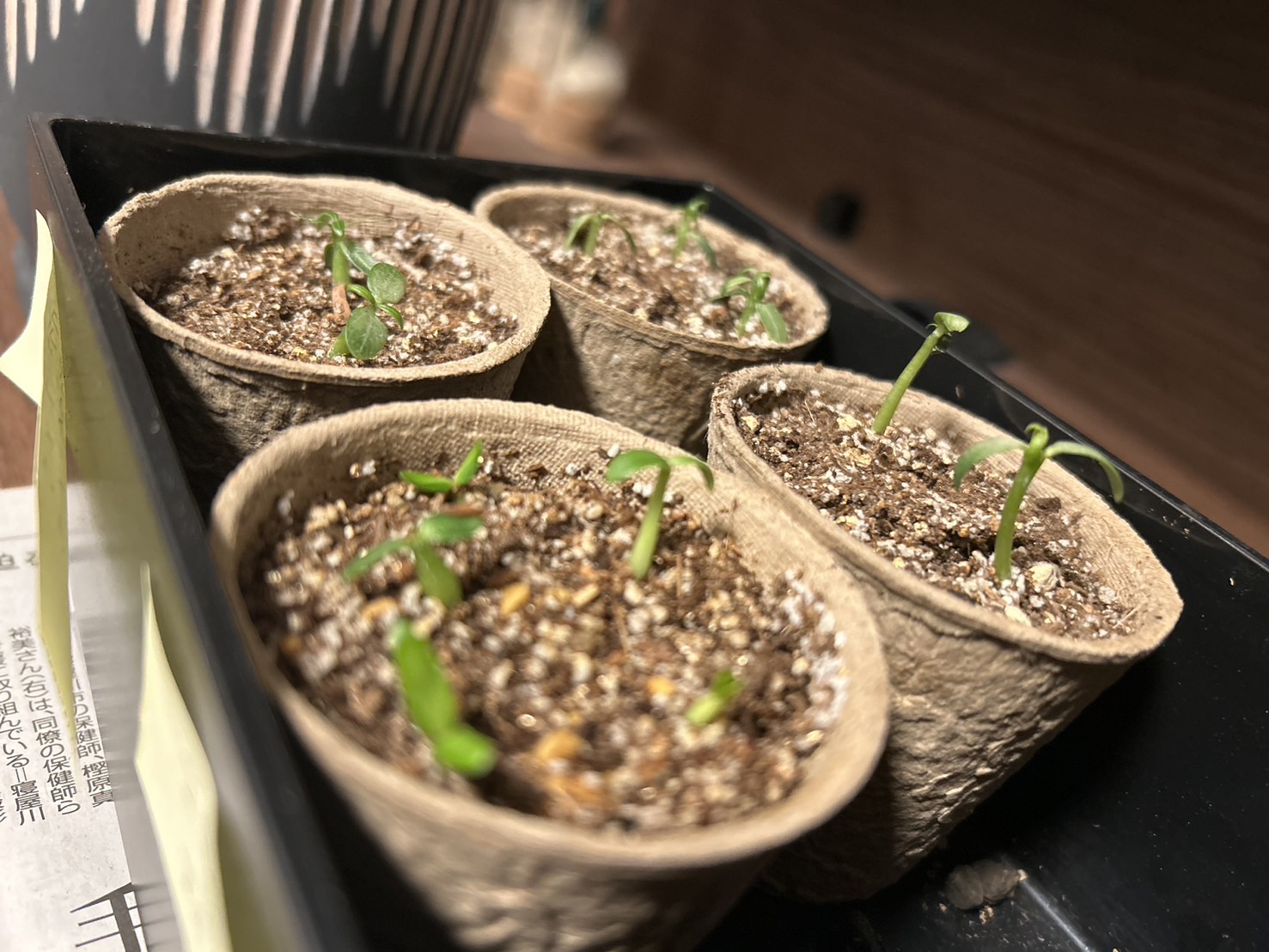 播種日:2024/3/30撮影日:2024/4/912粒中10粒発芽、内1つが溶けて9粒が成長中。エ...