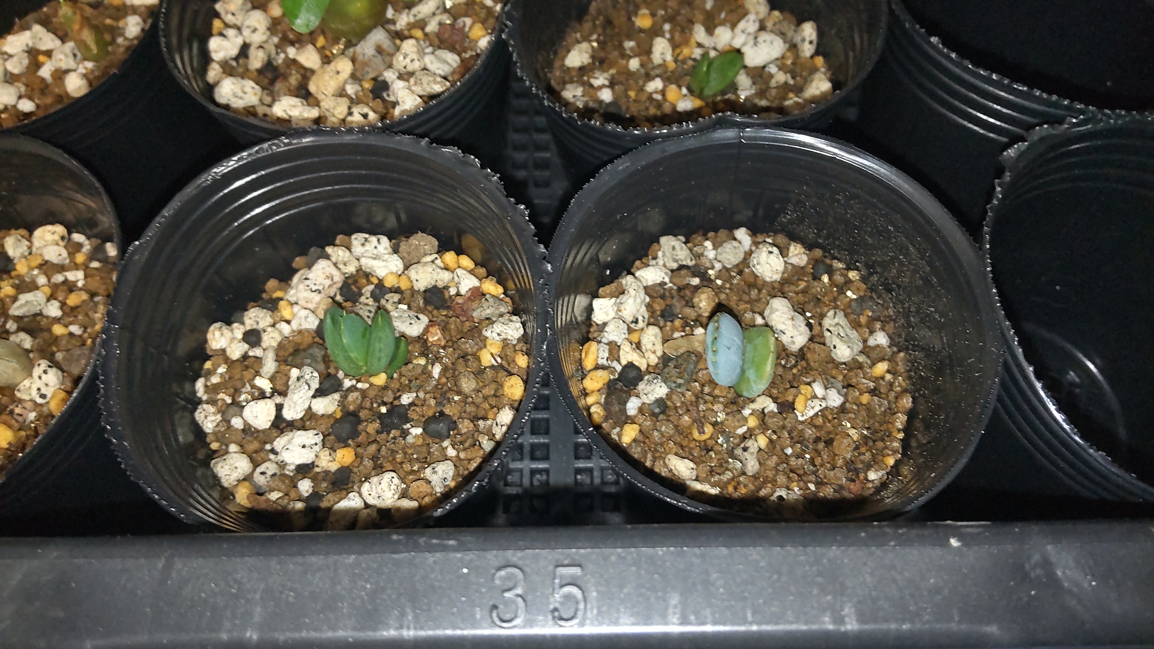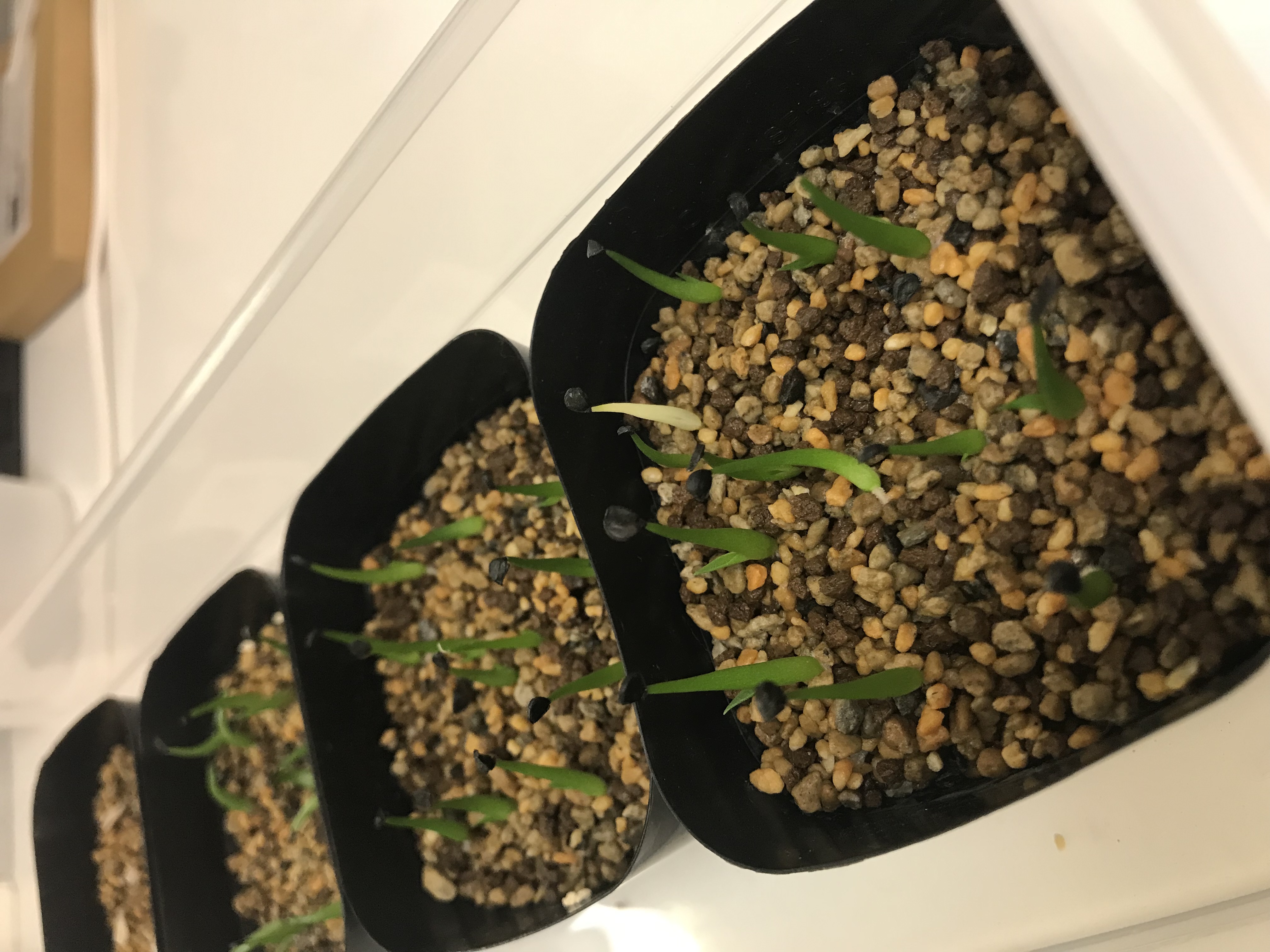 オーソサイド+メネデールに漬込みしてから播種。腰水管理。1つは腐ってしまった、光量不足か塩類集積によ...