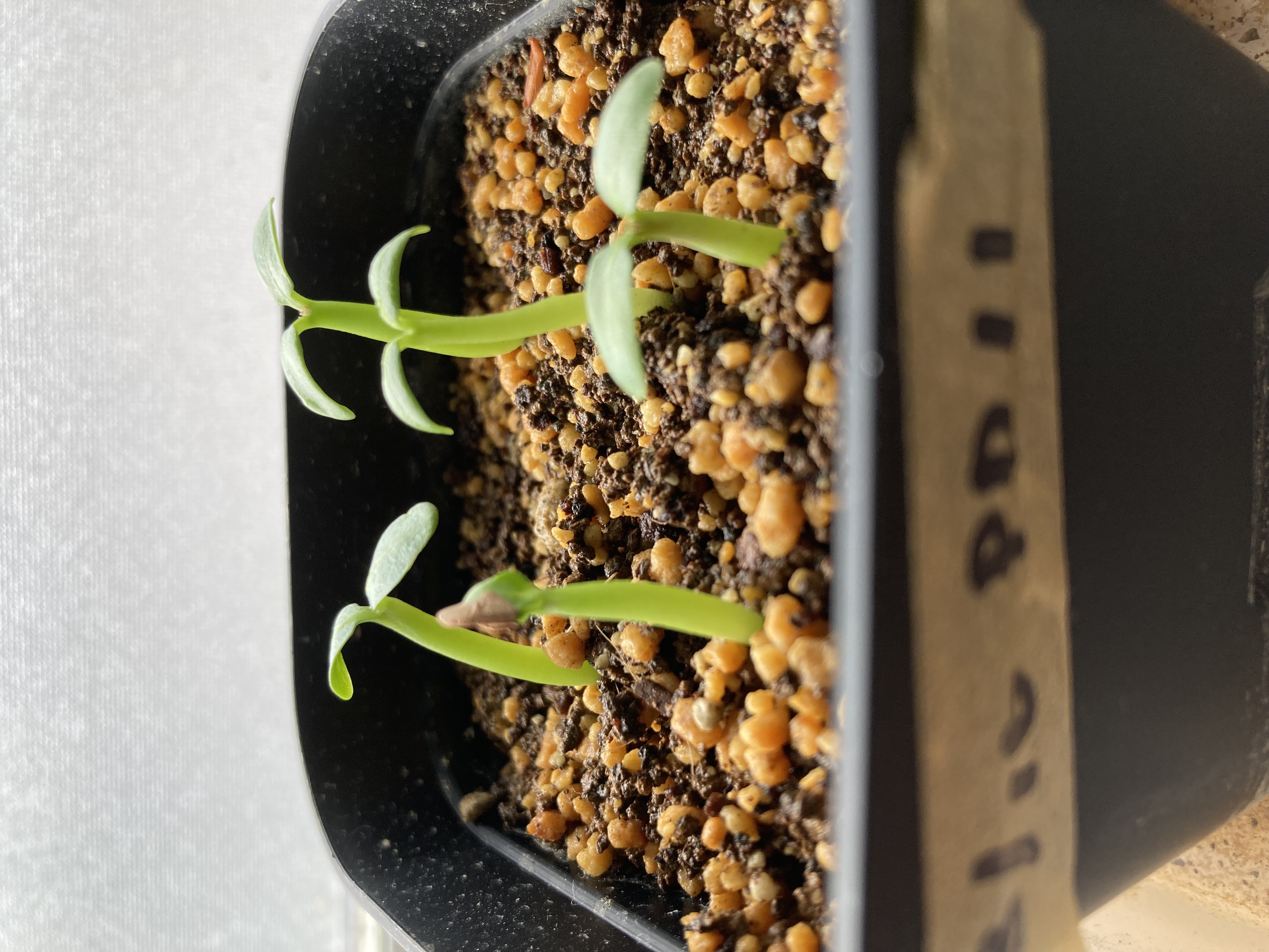 • 5個中3個発芽、一つはしっかりとした双葉と太い幹のようなフォルムが出始めている。