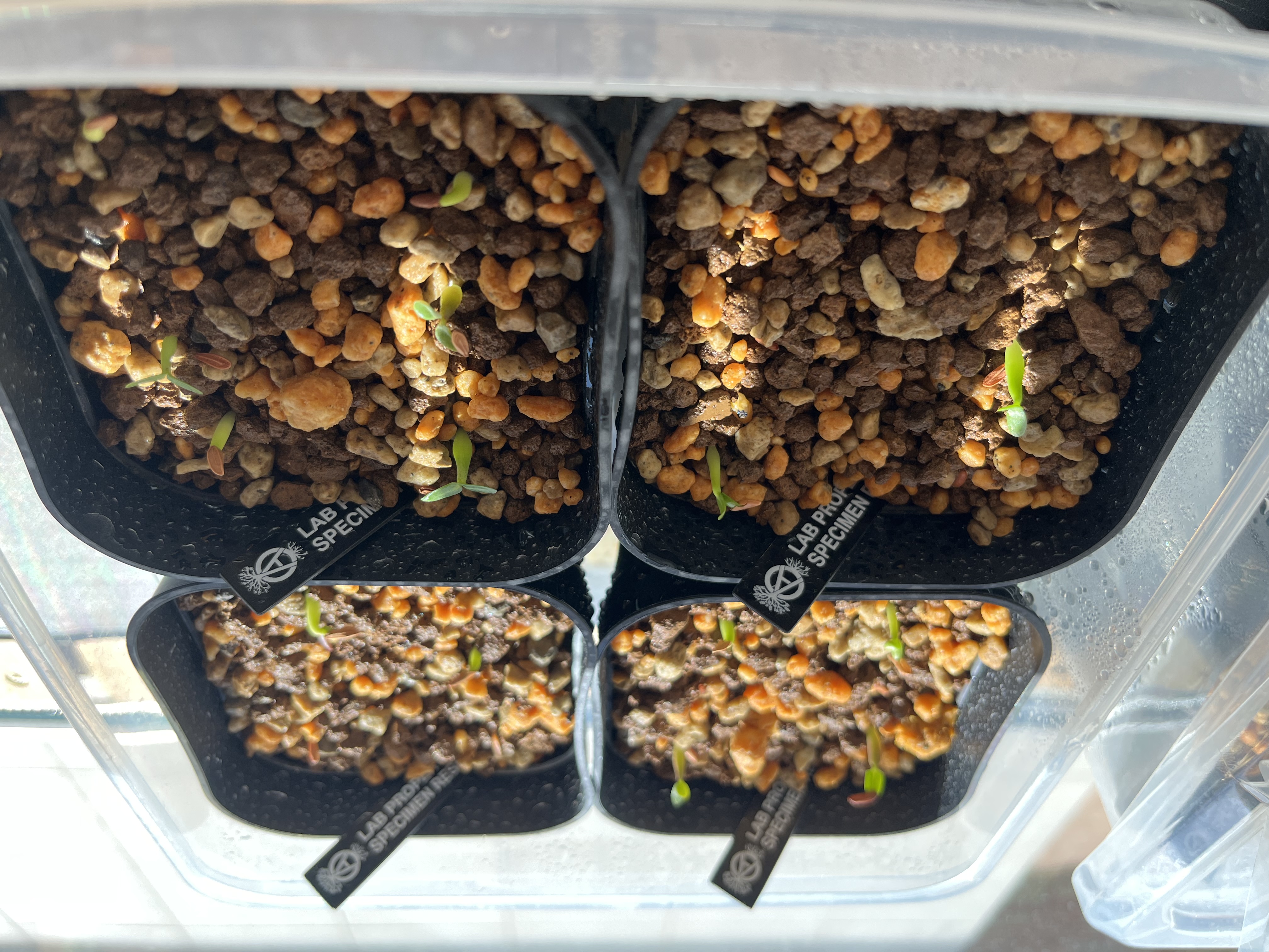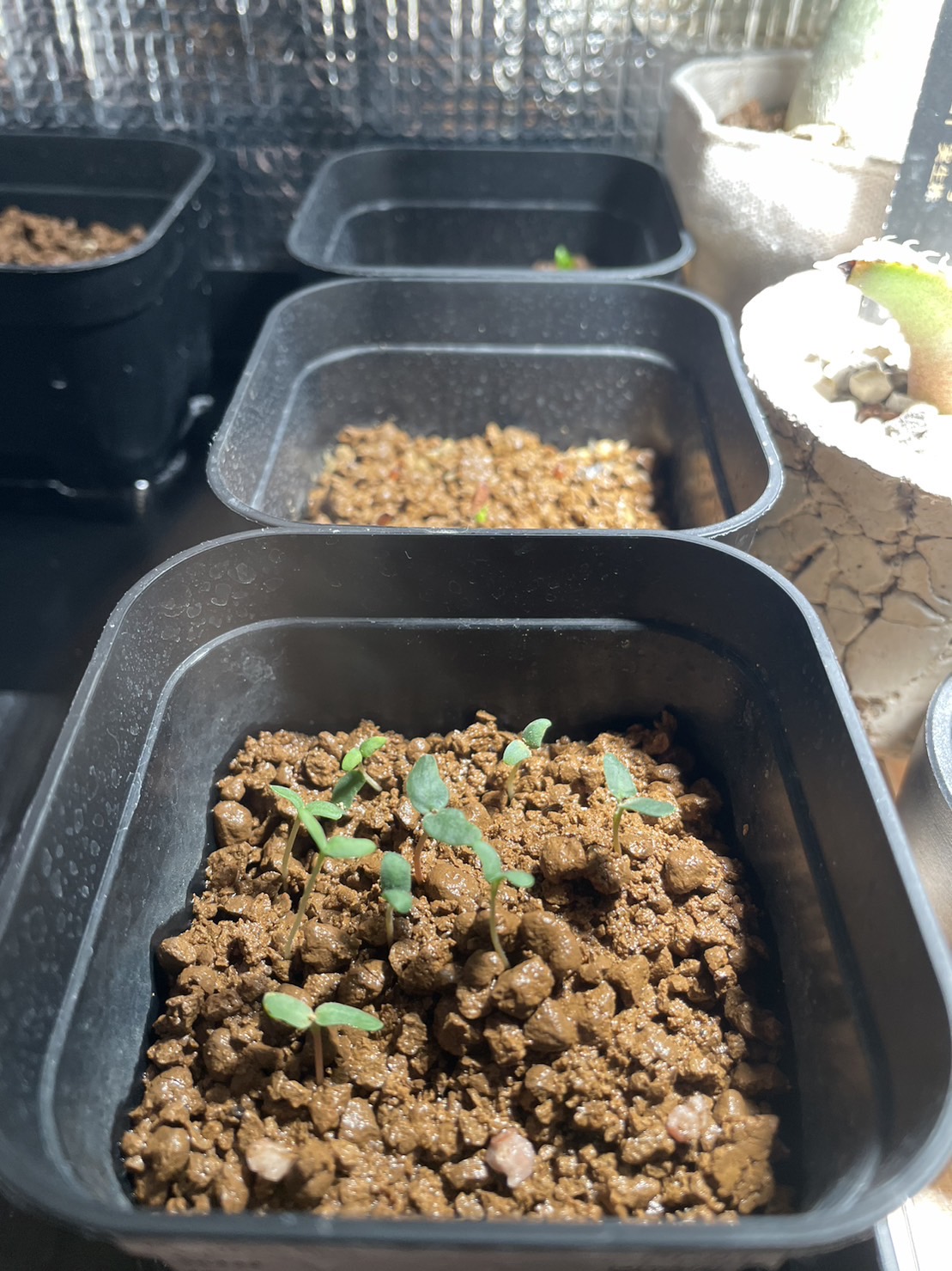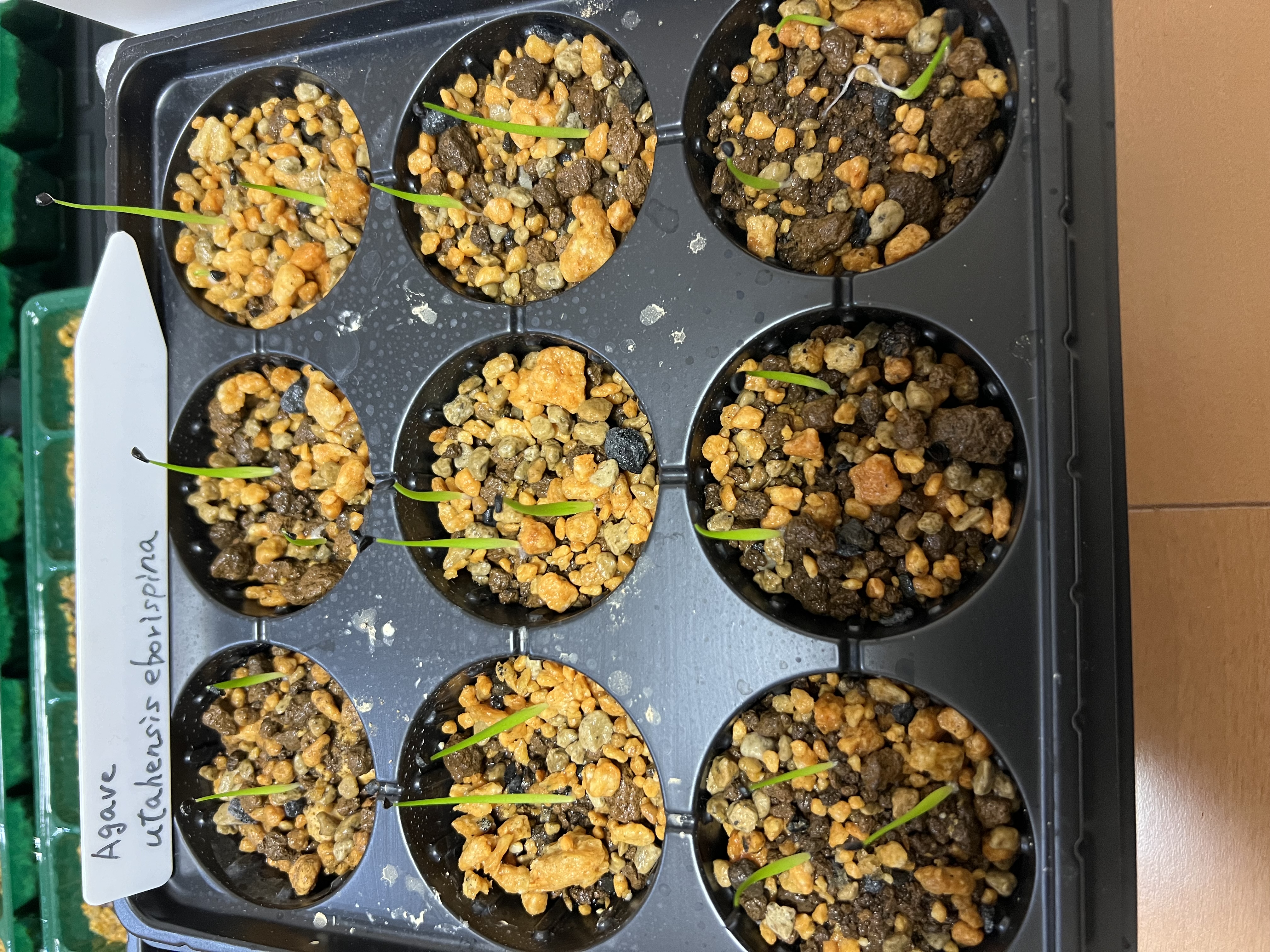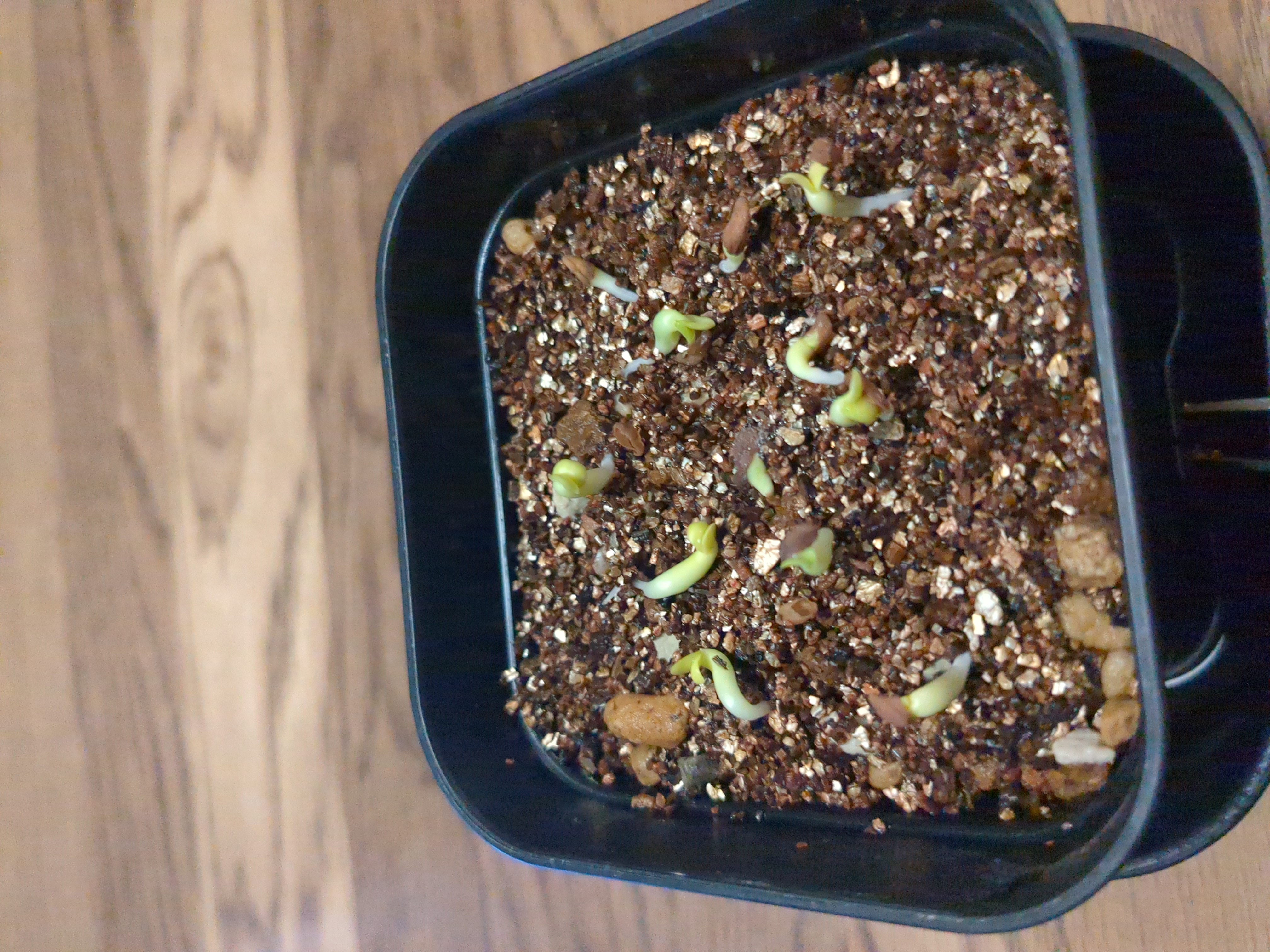 13粒中10粒が発芽中。播種から継続して簡易温室(室温25-30℃、湿度50%前後)にて管理中。メネ...