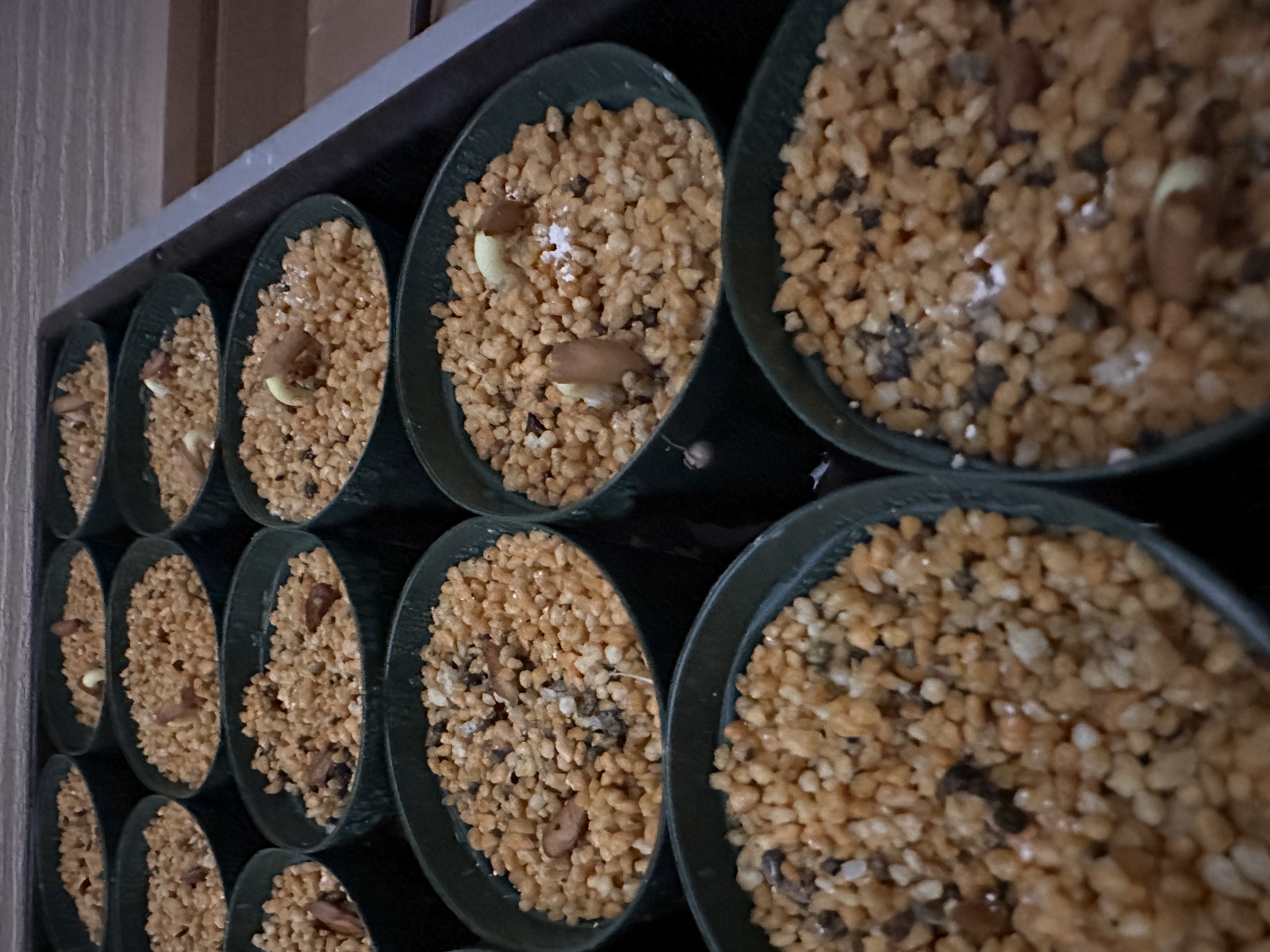 2024.2.11播種。2〜3日で全て発芽。メネデール希釈水に半日漬けてから種子の尖っている方を下に...