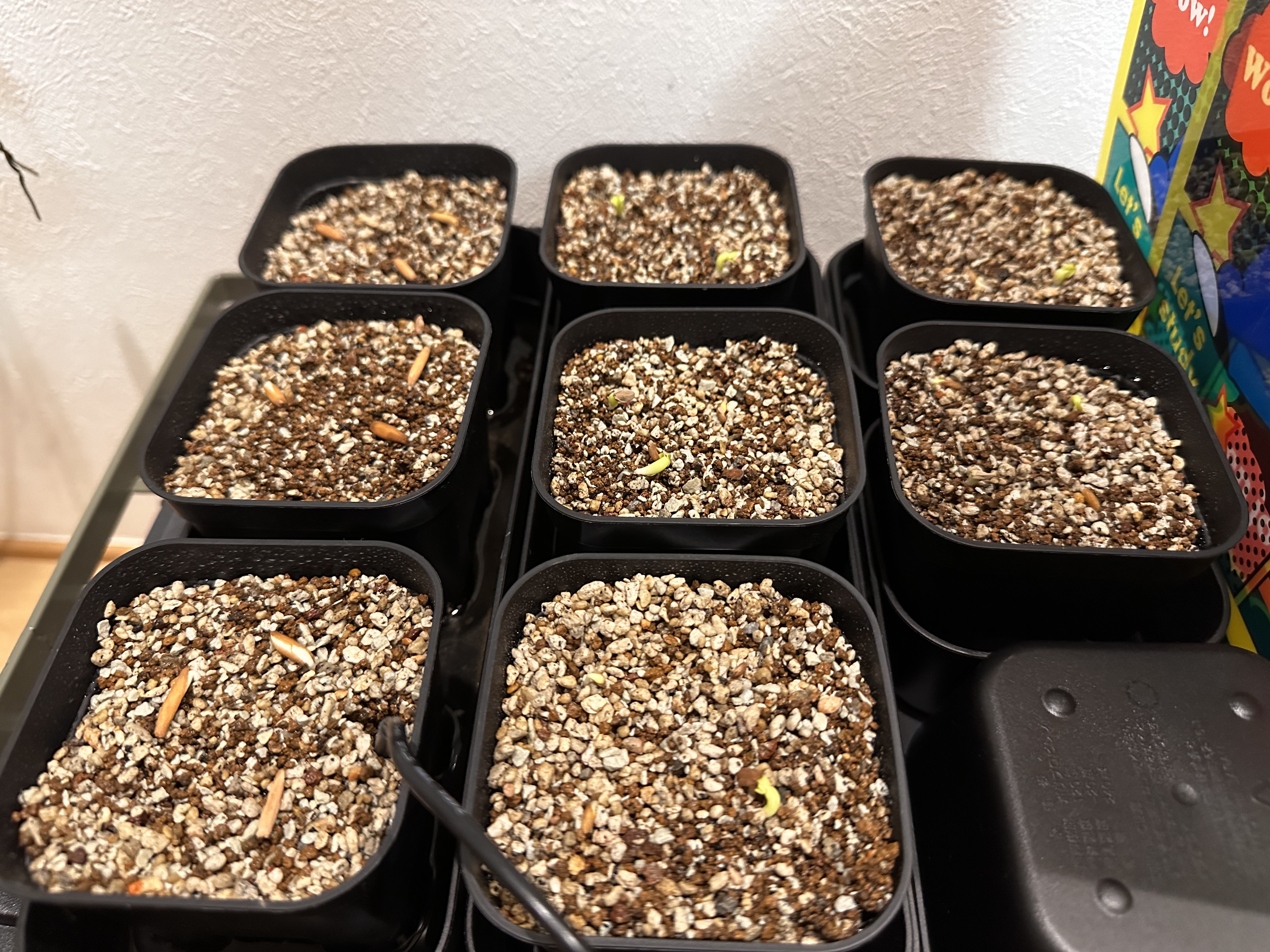 20個種まき▶︎16発芽発芽率80%ベンレート、メネデールバーミキュライトタッパー腰水、屋内管理...