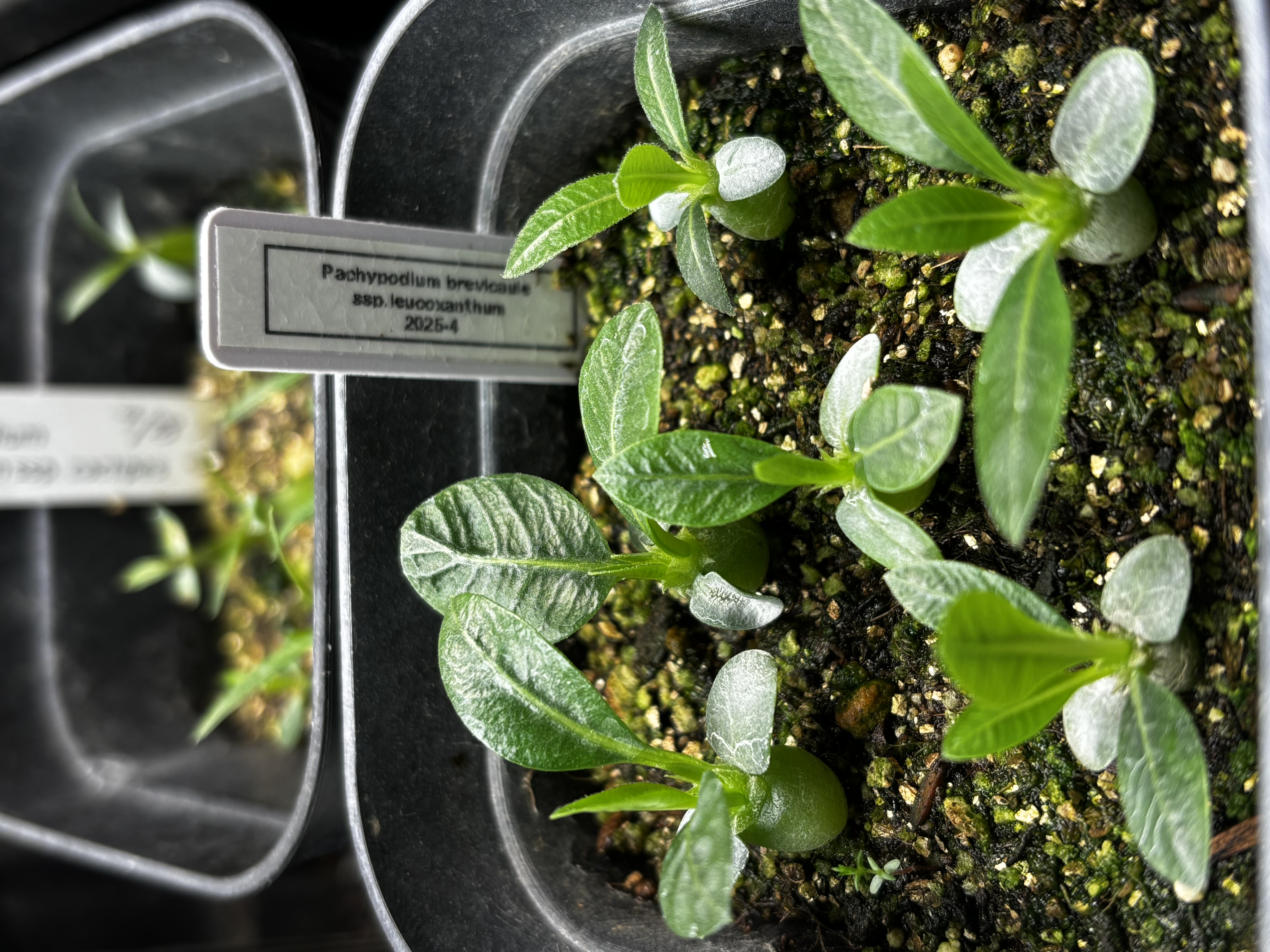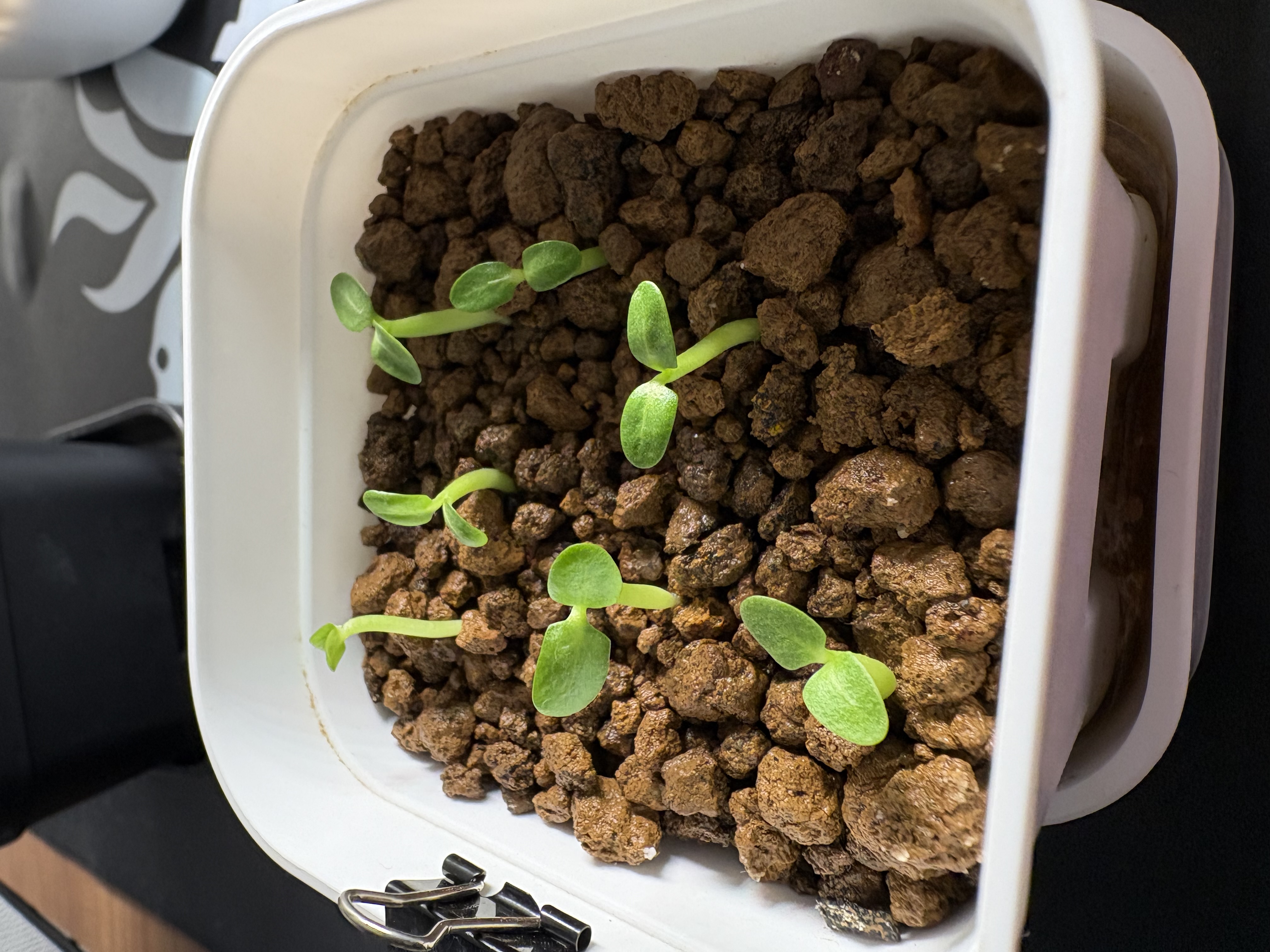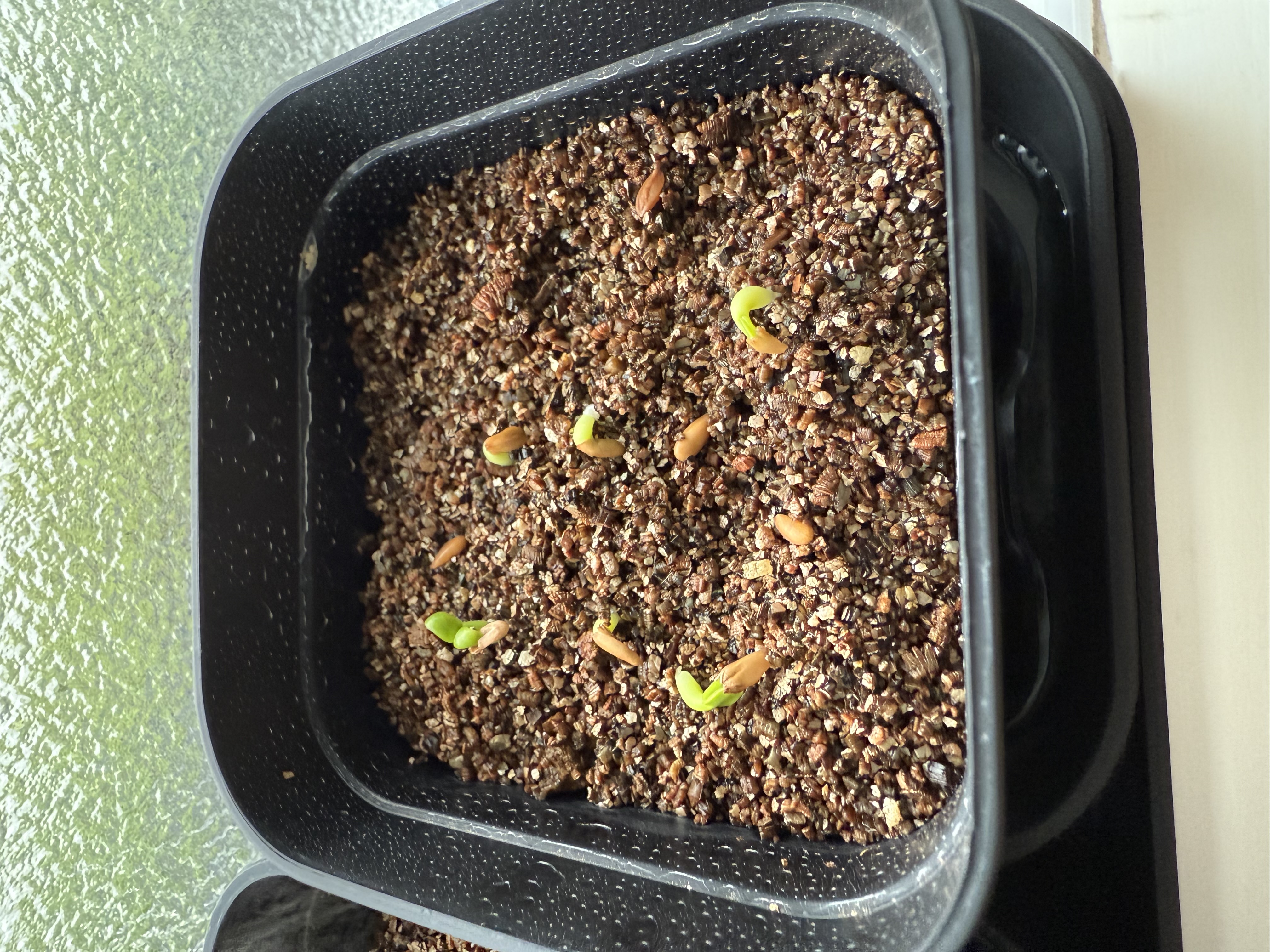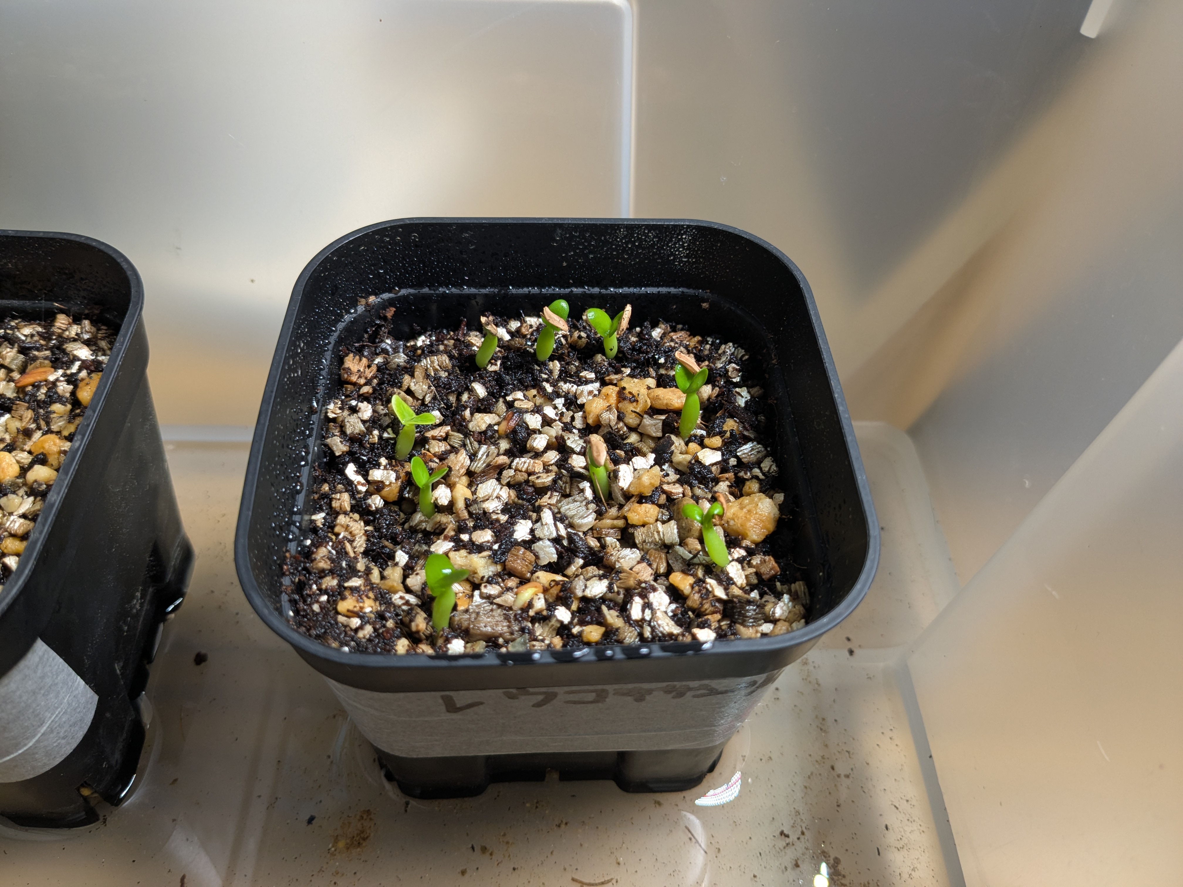 2025/5/27播種2025/6/1撮影6/11粒発芽、3粒カビで脱落赤玉、鹿沼、軽石1:1:2の...