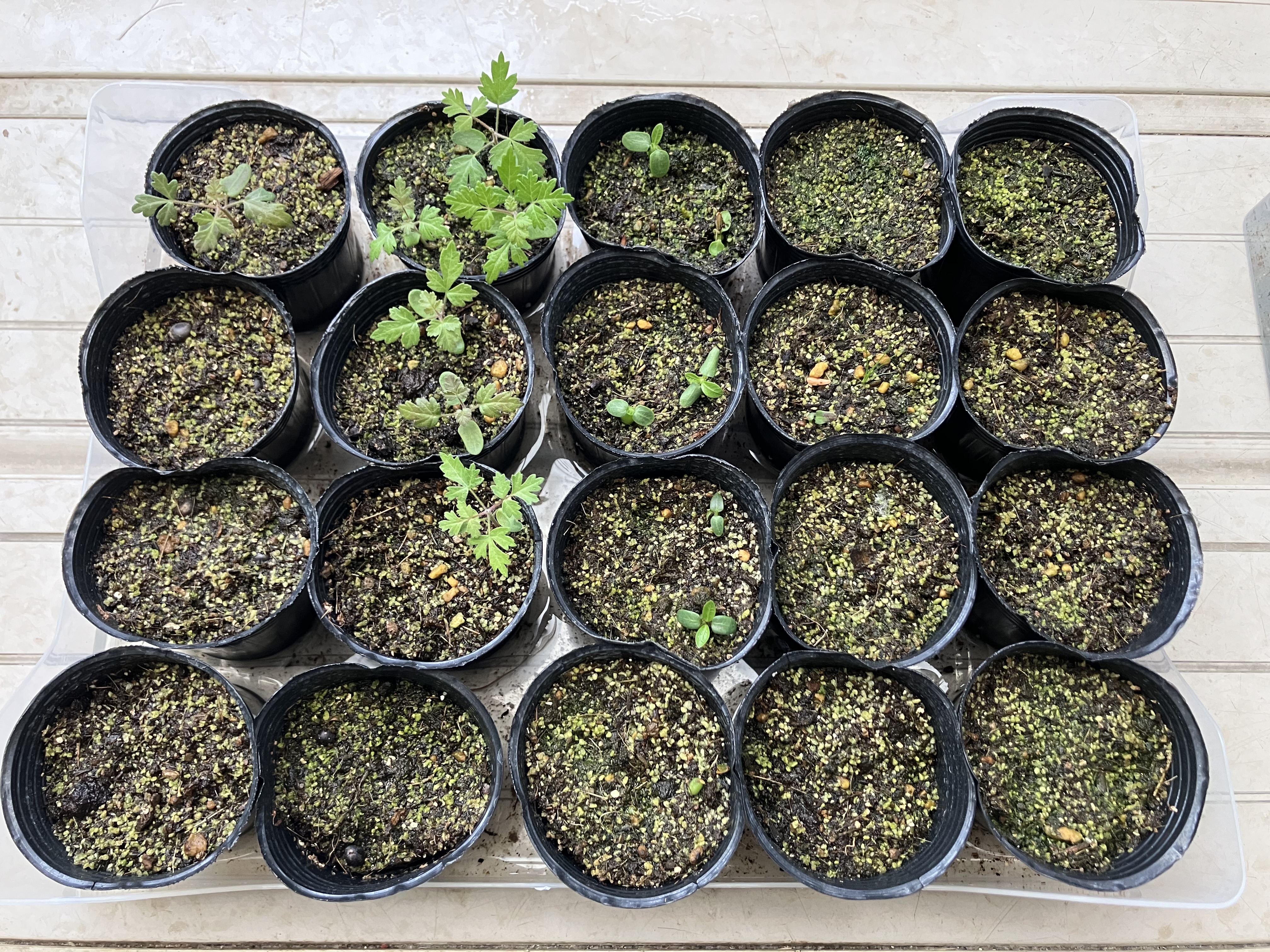 画像1番左の列の手前から3つと左から2番目の列の1番手前の4ポット[ 播種日 / 撮影日 ] 202...
