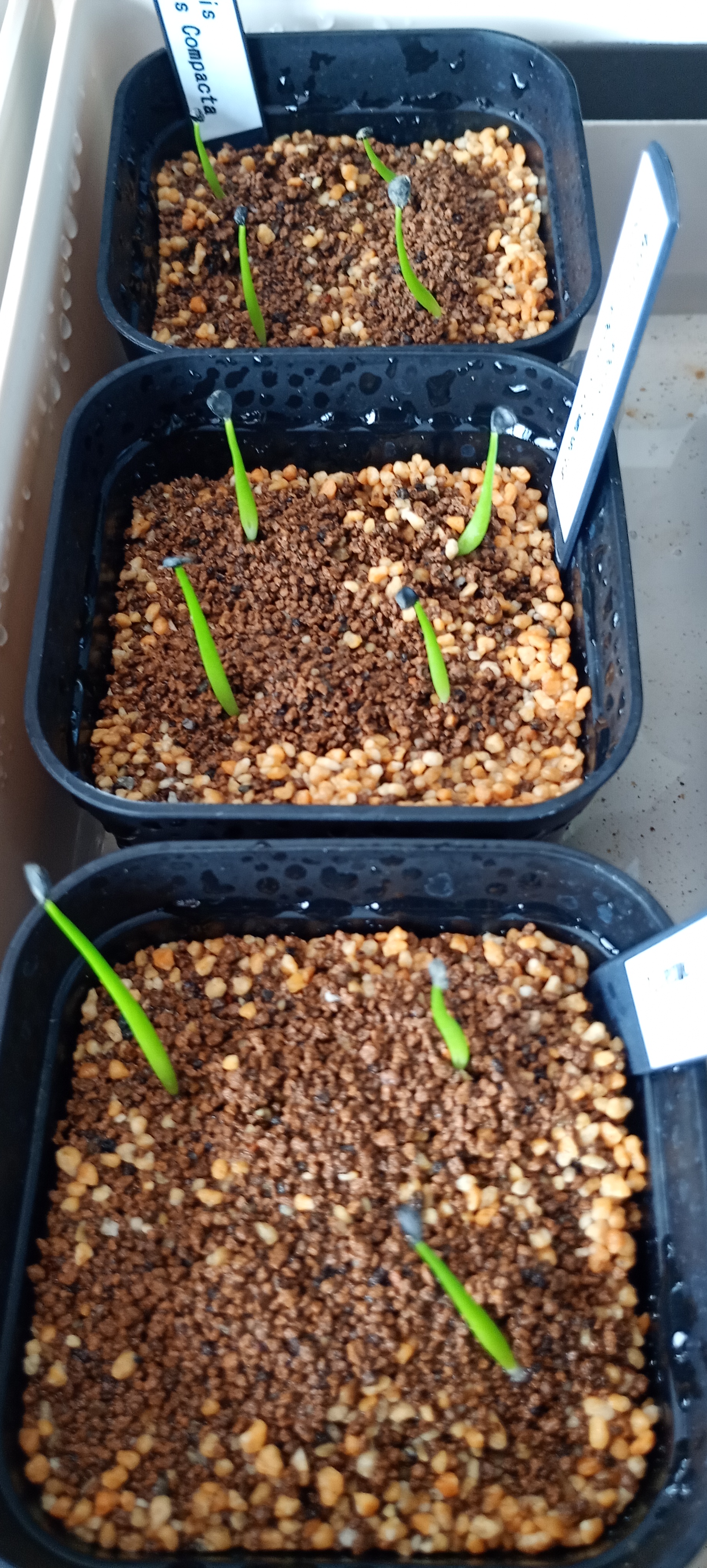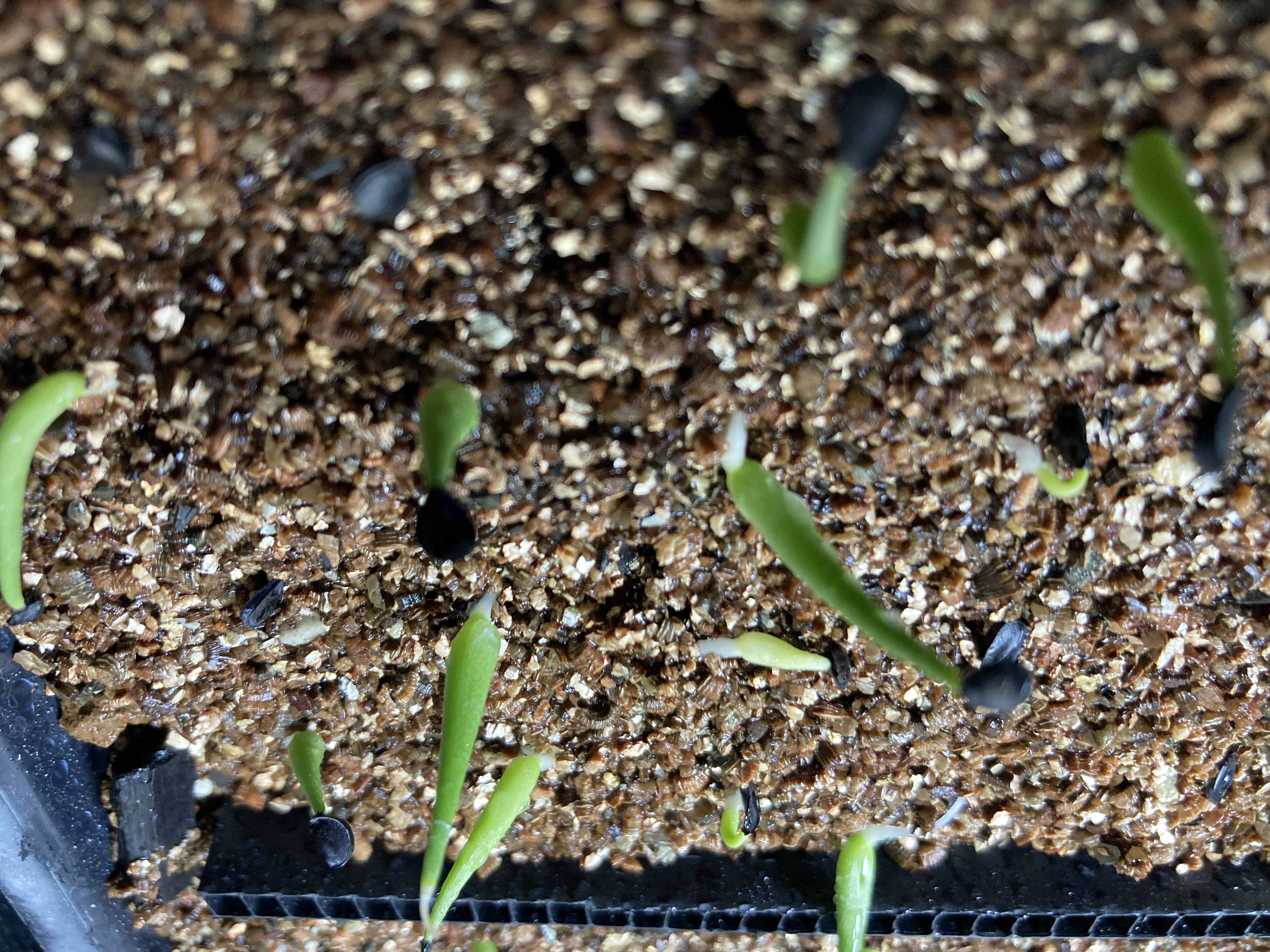 2025/2/10播種、3/5撮影発芽率24/24ベンレート+メネデール混合液に24時間浸し、赤玉細...
