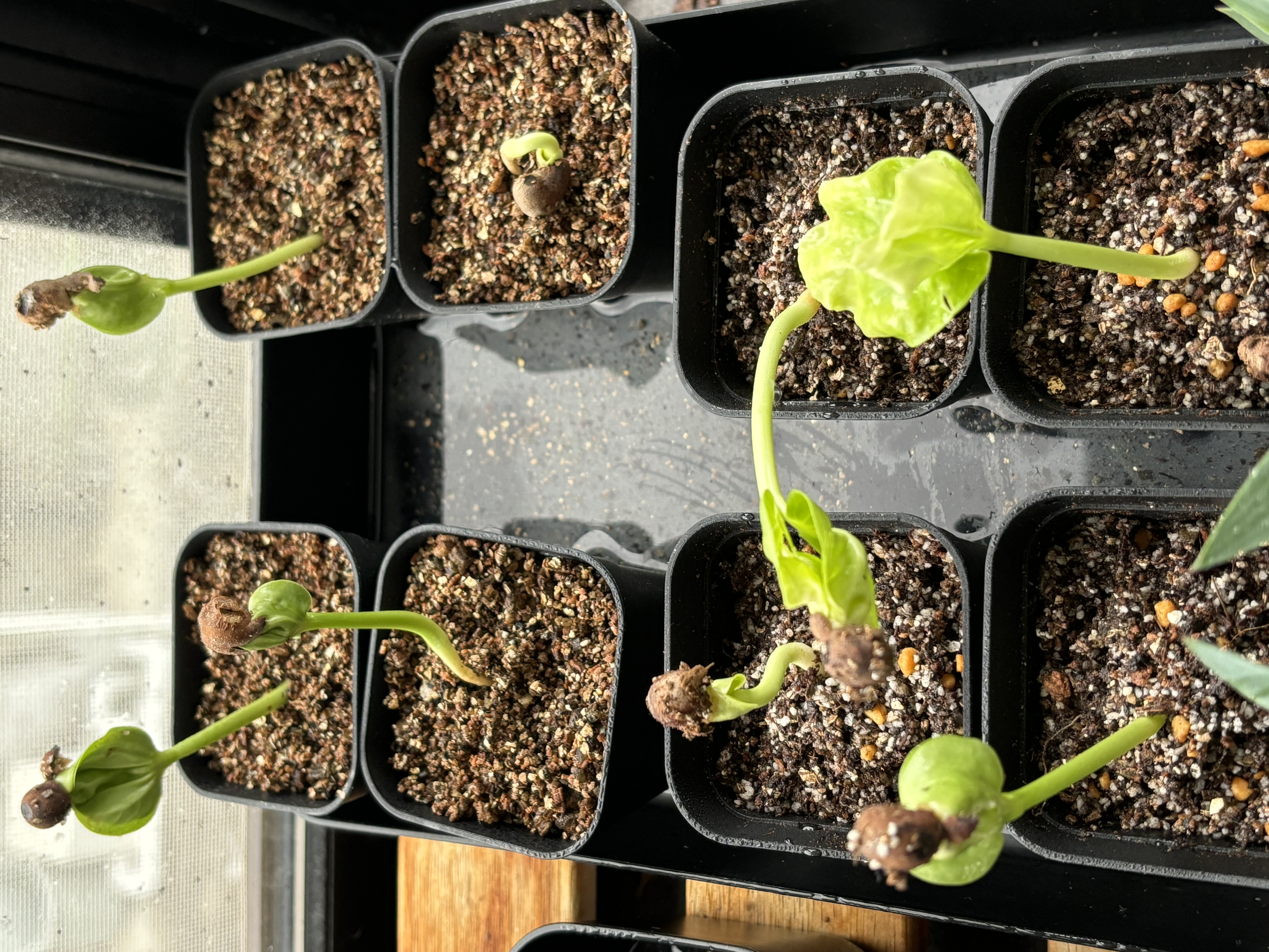 2024/7/22播種、7/27撮影12粒中8粒発芽播種の40時間程前に約80℃のお湯に入れて放置。...