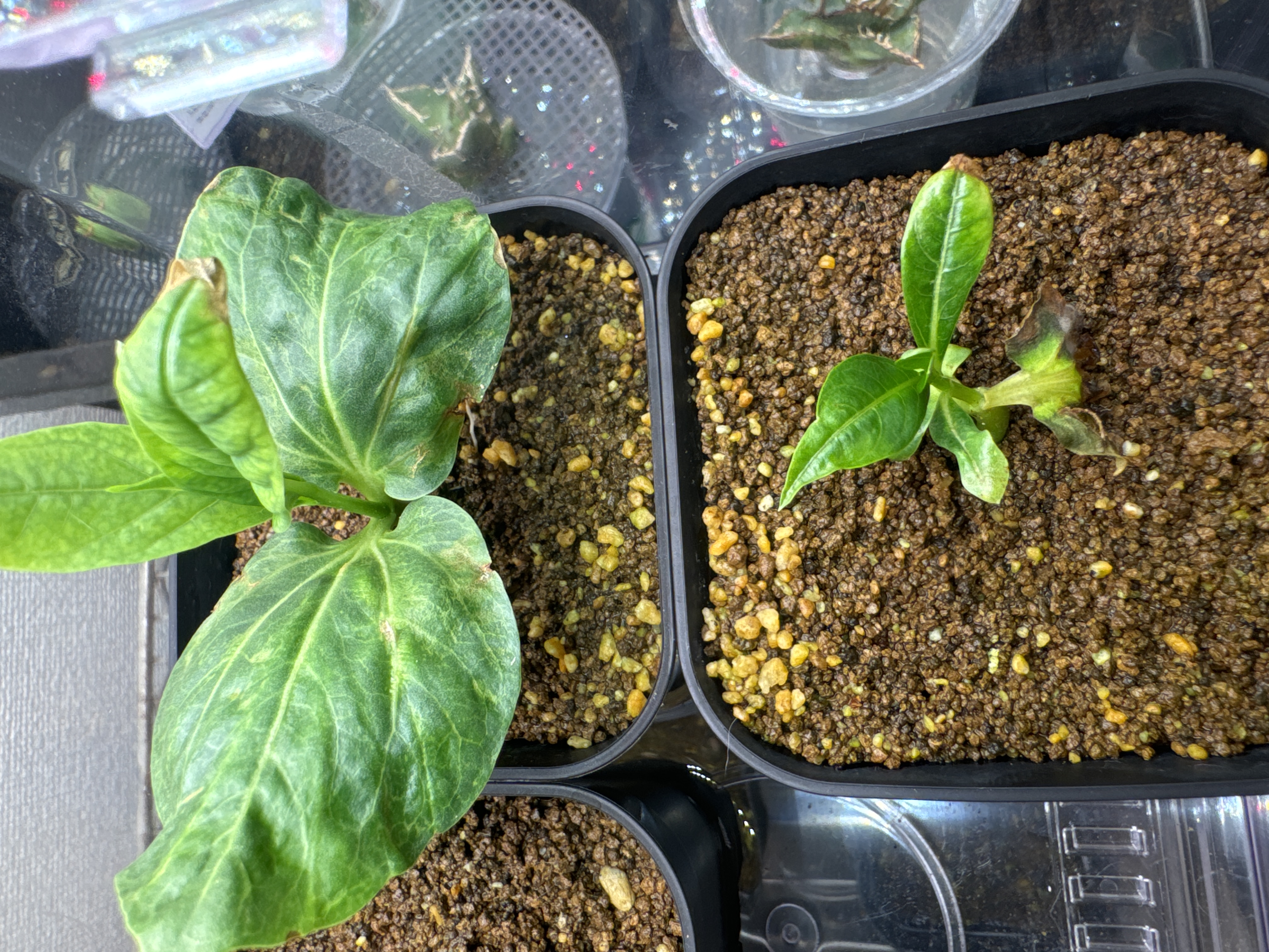 撒いて2週間。発根率は60%ほど。発根して根っこ周りに小さな虫がびっしり付いてて食べられてる様子…虫...