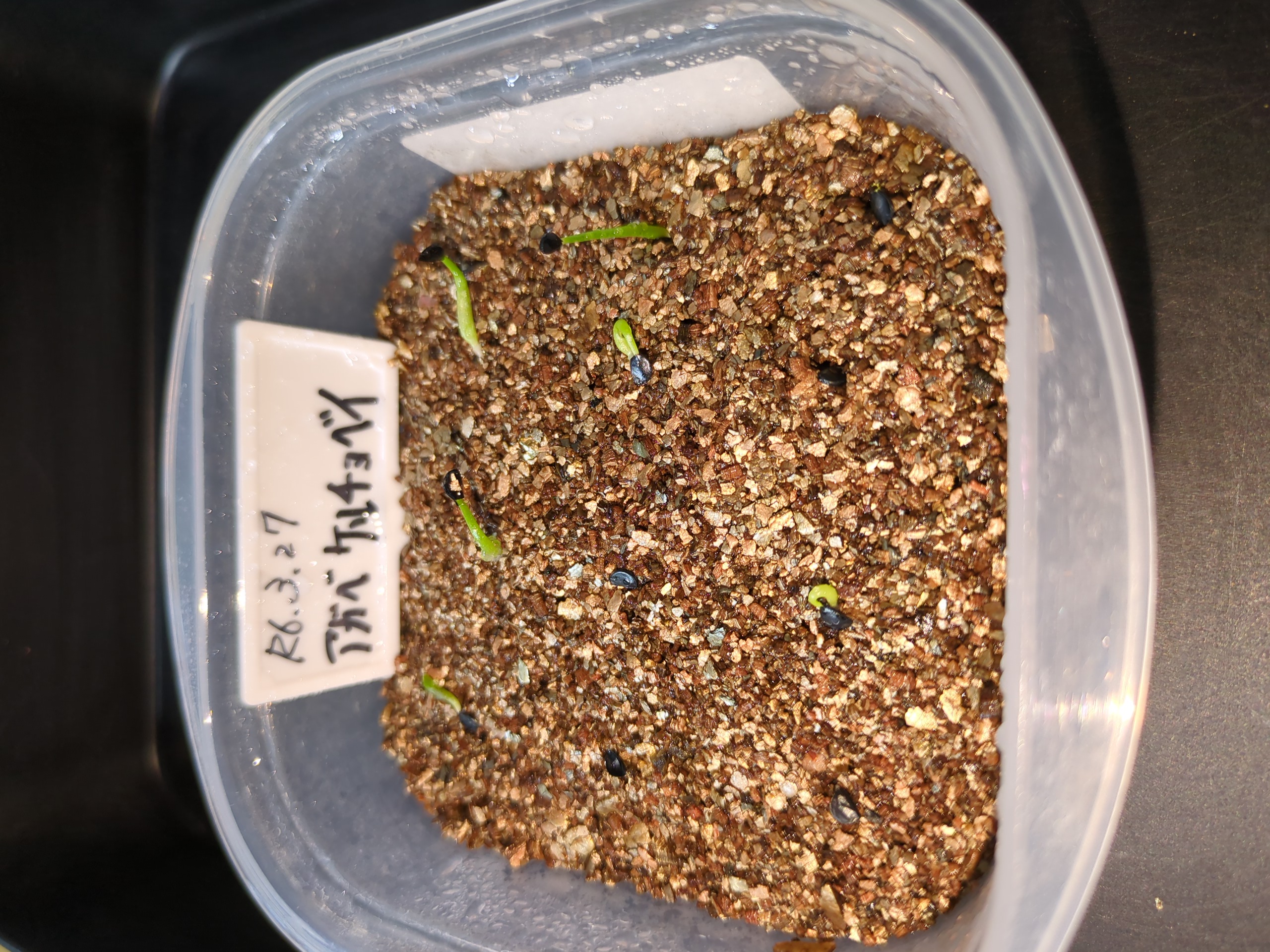 3月末 1日浸水後水ひたひたのティッシュ床に播種、軽くラップで蓋5日ぐらいからパラパラと発根確認、鉢...