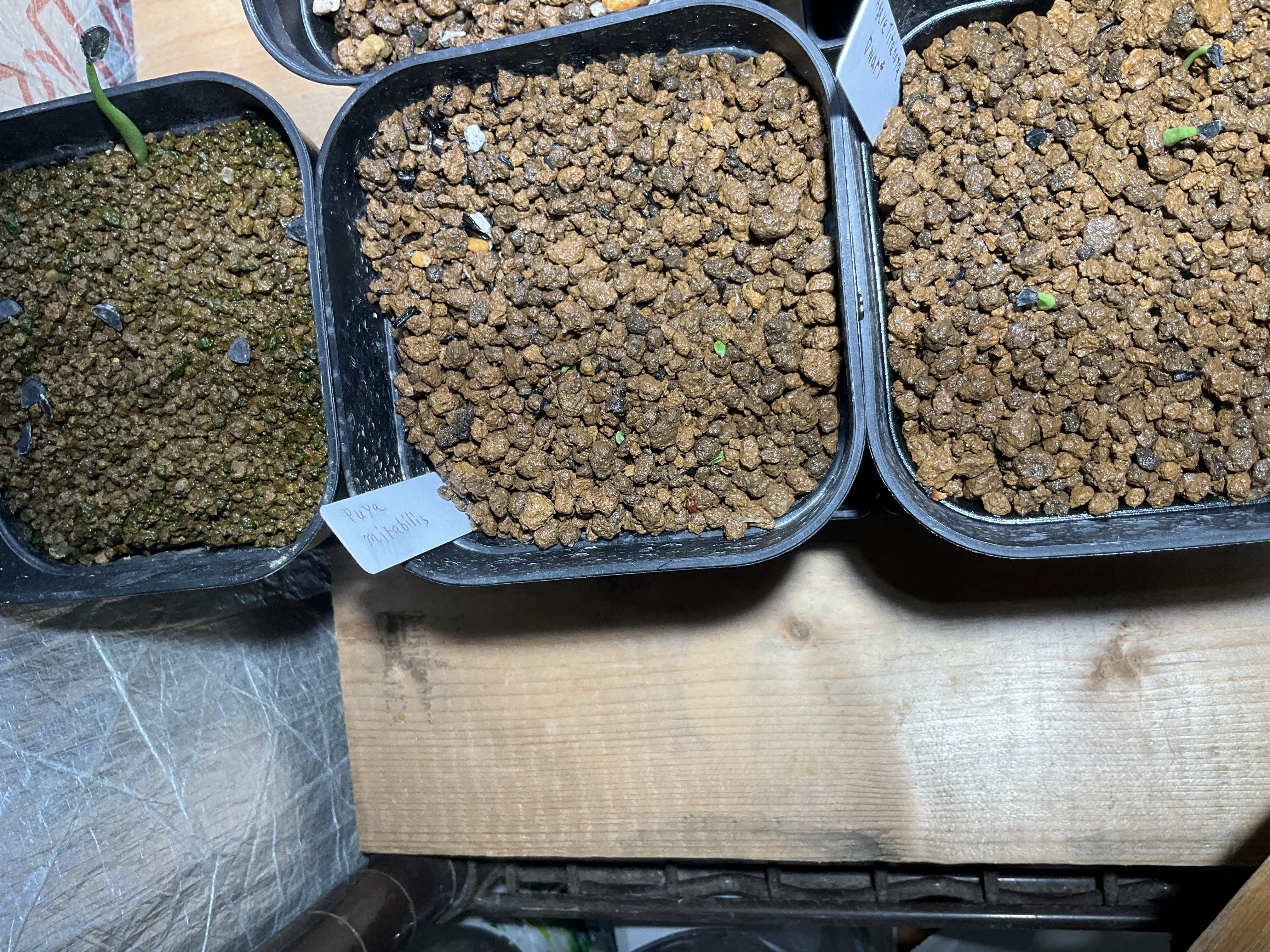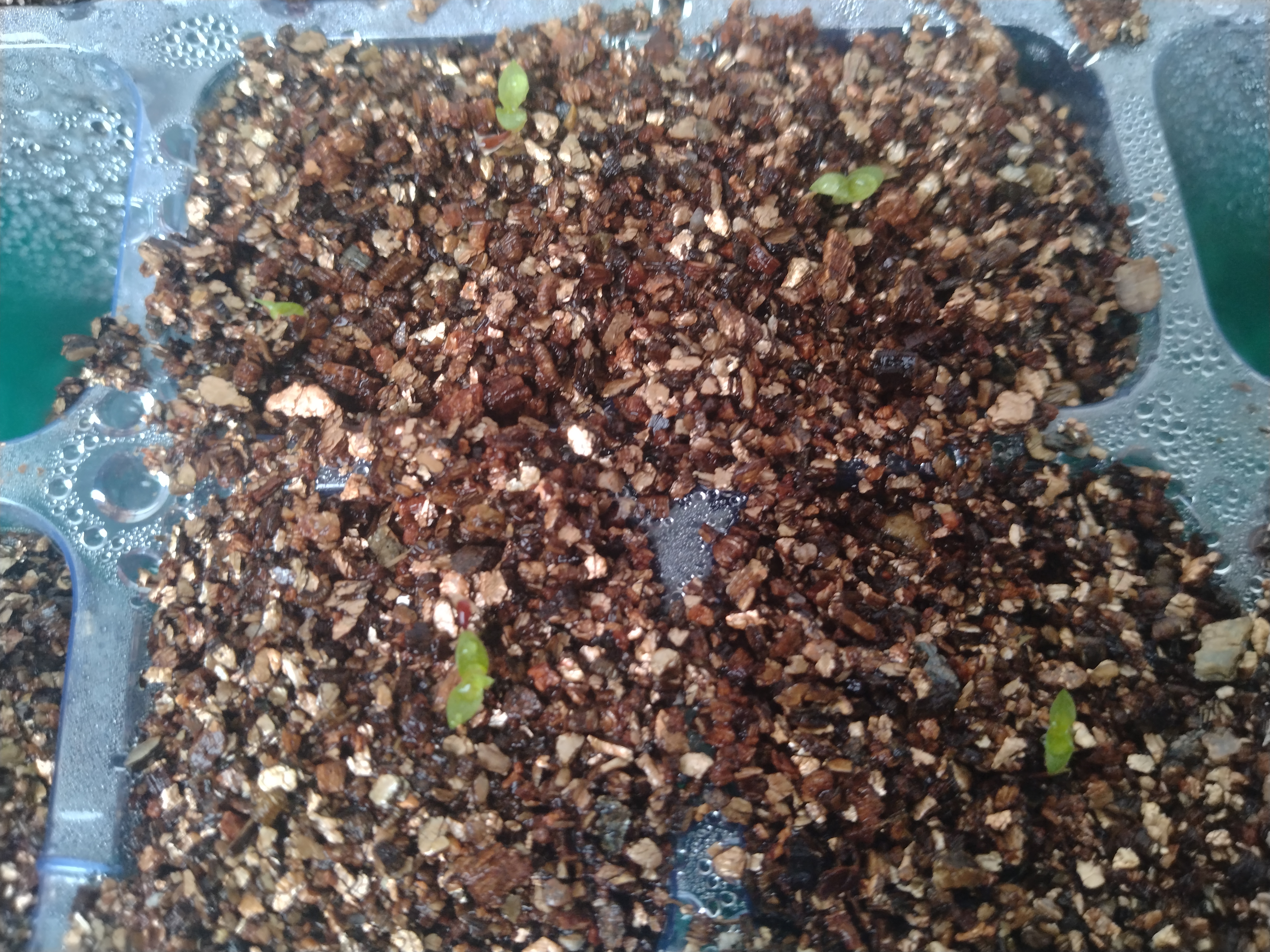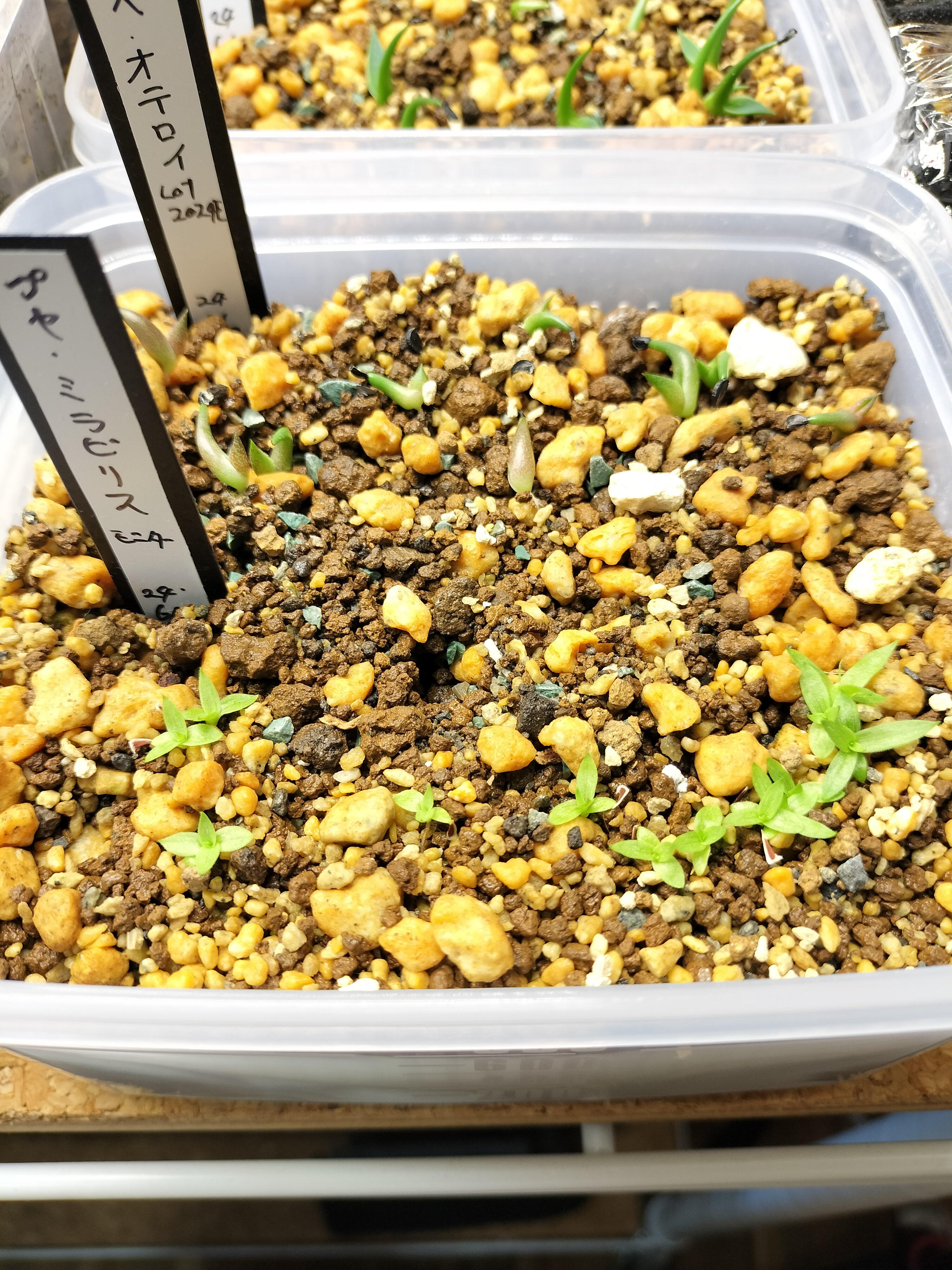 播種日6/8 撮影日6/15播種数15ぐらい 発芽9赤玉土1.軽石1管理温度25度程度少しずつ発芽中...