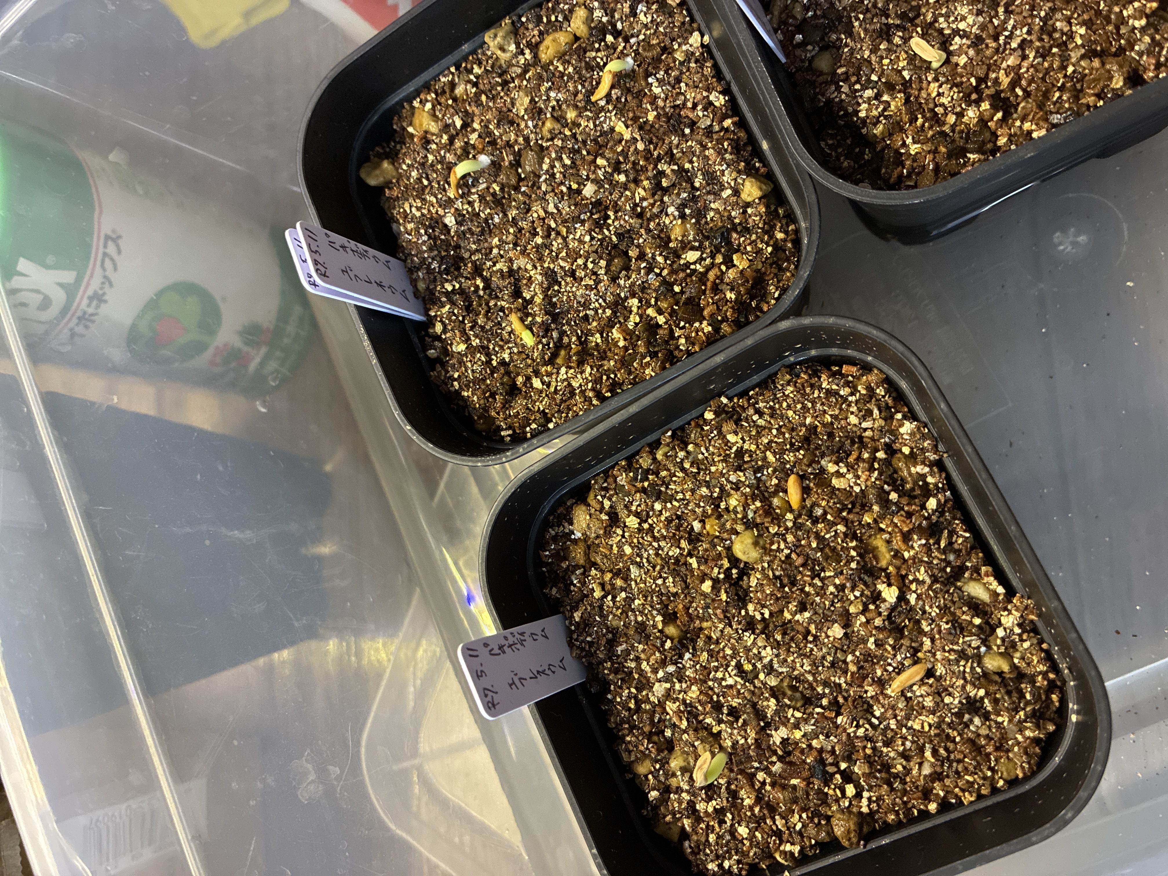 2025/5/17播種、2025/5/25撮影12粒播種/4粒発芽ベンレート、メネデールの溶液に半日...