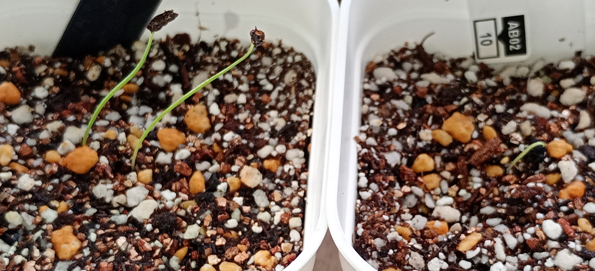2025.4.20頃播種。5.10撮影。種まきの土使用。室内25度くらいの机の上で管理。4.28に芽...
