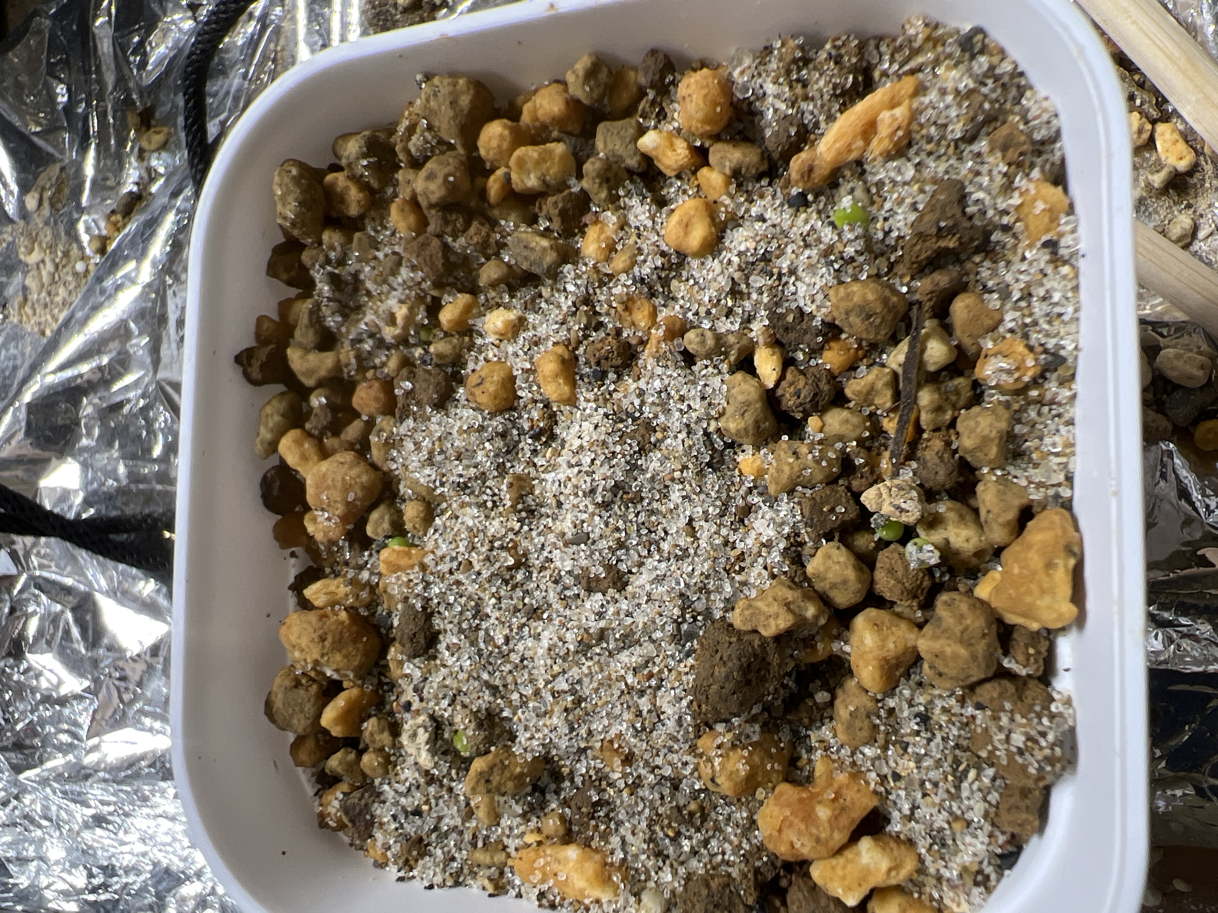 播種日6/8撮影日6/15播種数25ぐらい 発芽5毎日発芽中温度管理25度程度覆土に砂をかけました...