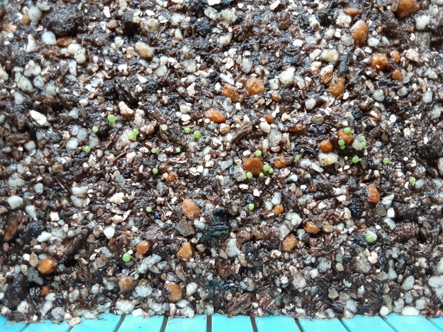 2025/5/31播種 2025/6/17撮影20粒中 10粒発芽湿らせたバーミキュライトに振り掛け...
