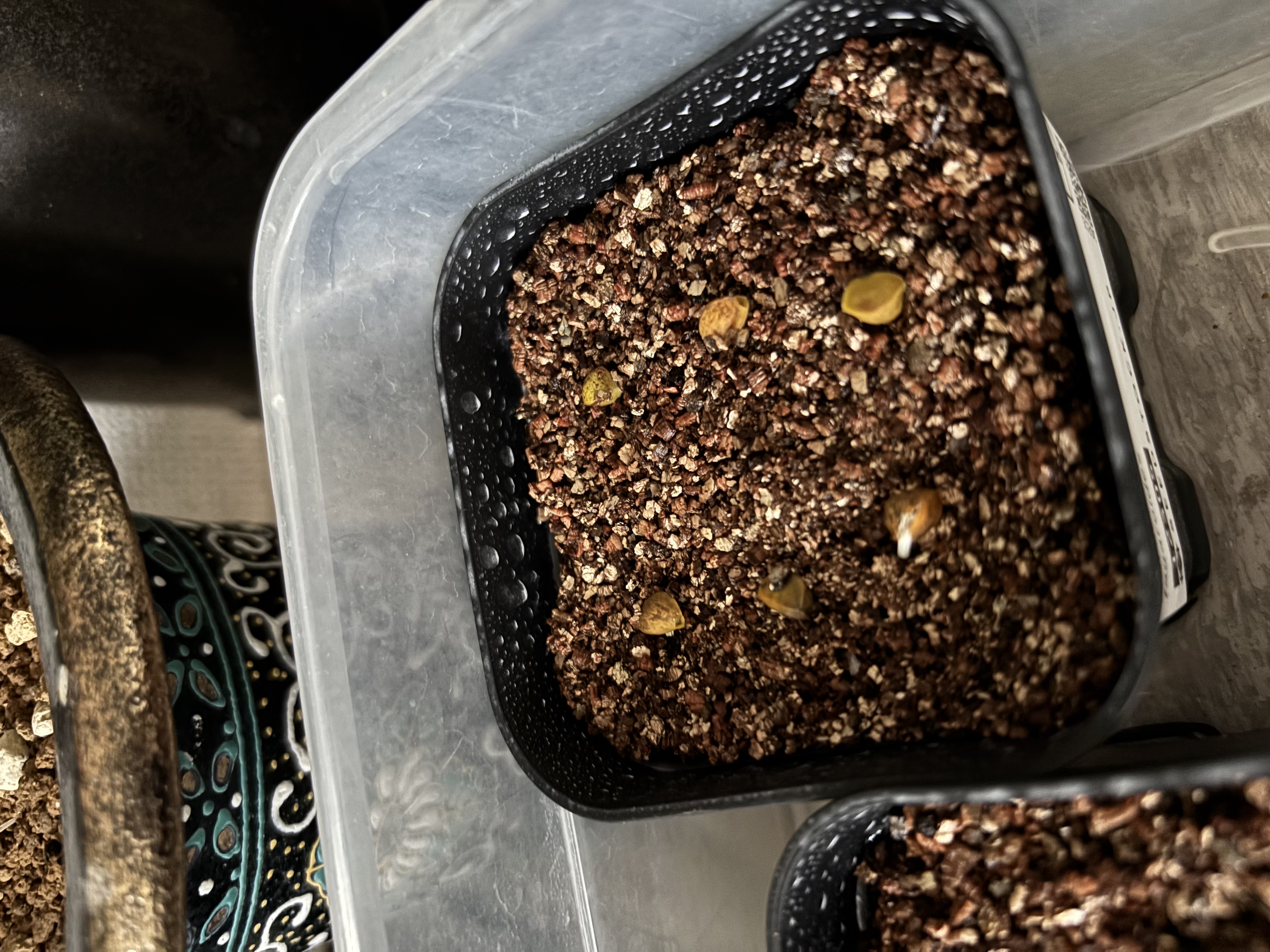 1日水に浸してふんわりラップ、底水。23-25℃、室内。土は普通の種まき用の土、ダコニールを1回回し...