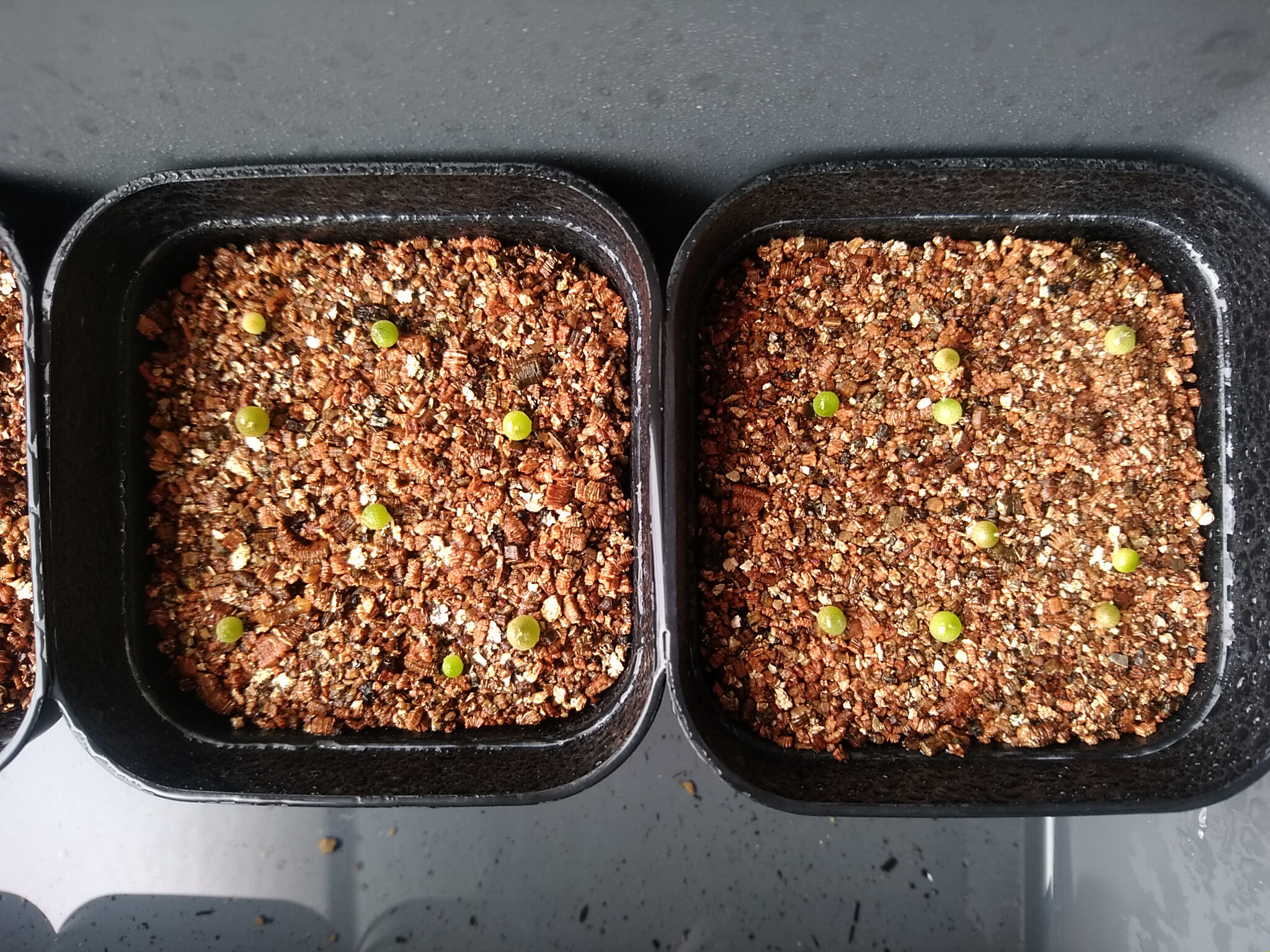 6月20日播種 7月2日撮影11粒だったかな 8粒発芽腰水管理で、赤玉、鹿沼、軽石の上にバーミキュラ...