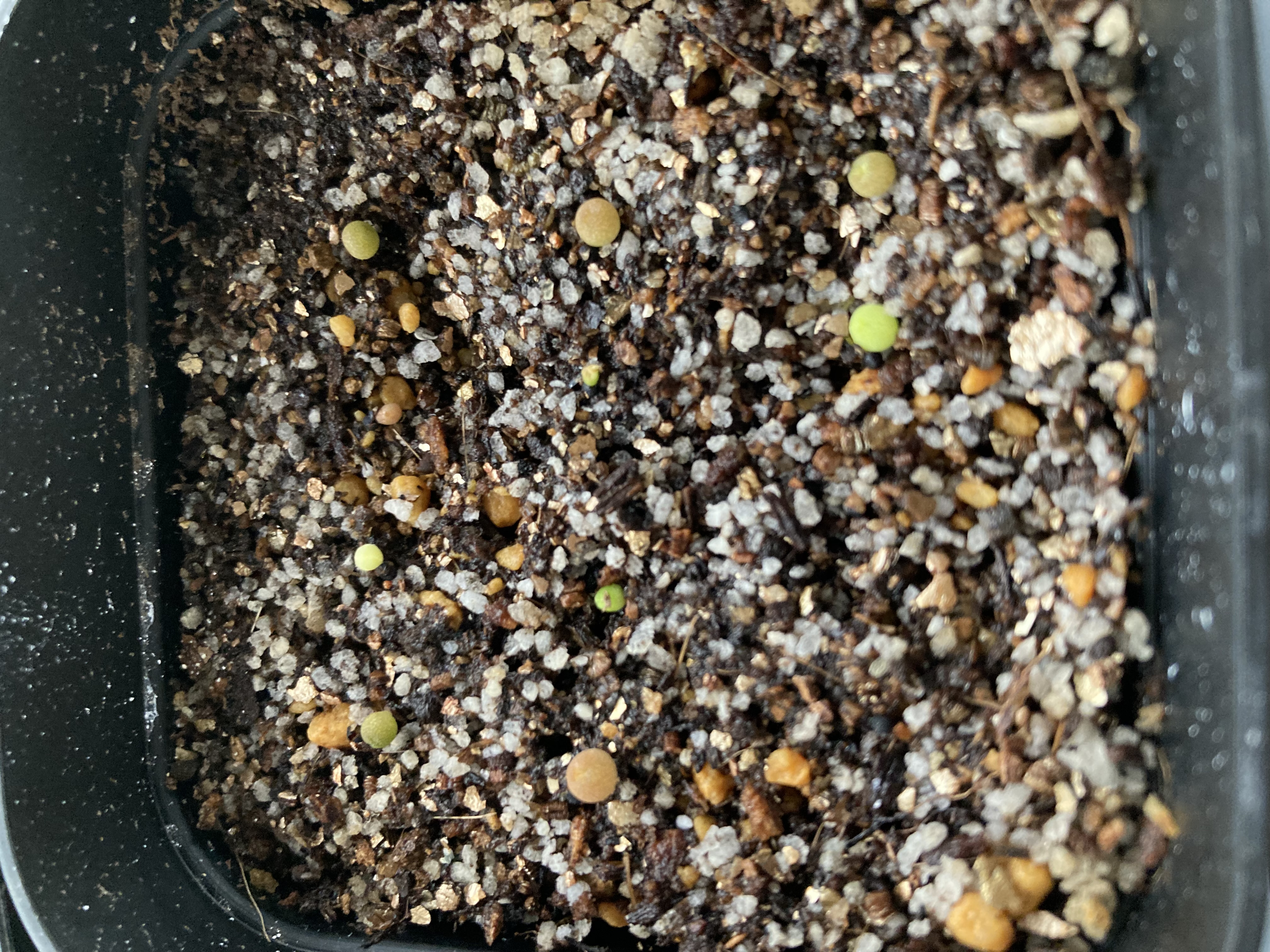 2024年6月15日播種 2024年7月15日 撮影10粒播種8粒発芽小粒赤玉の上にバーミキュライト...