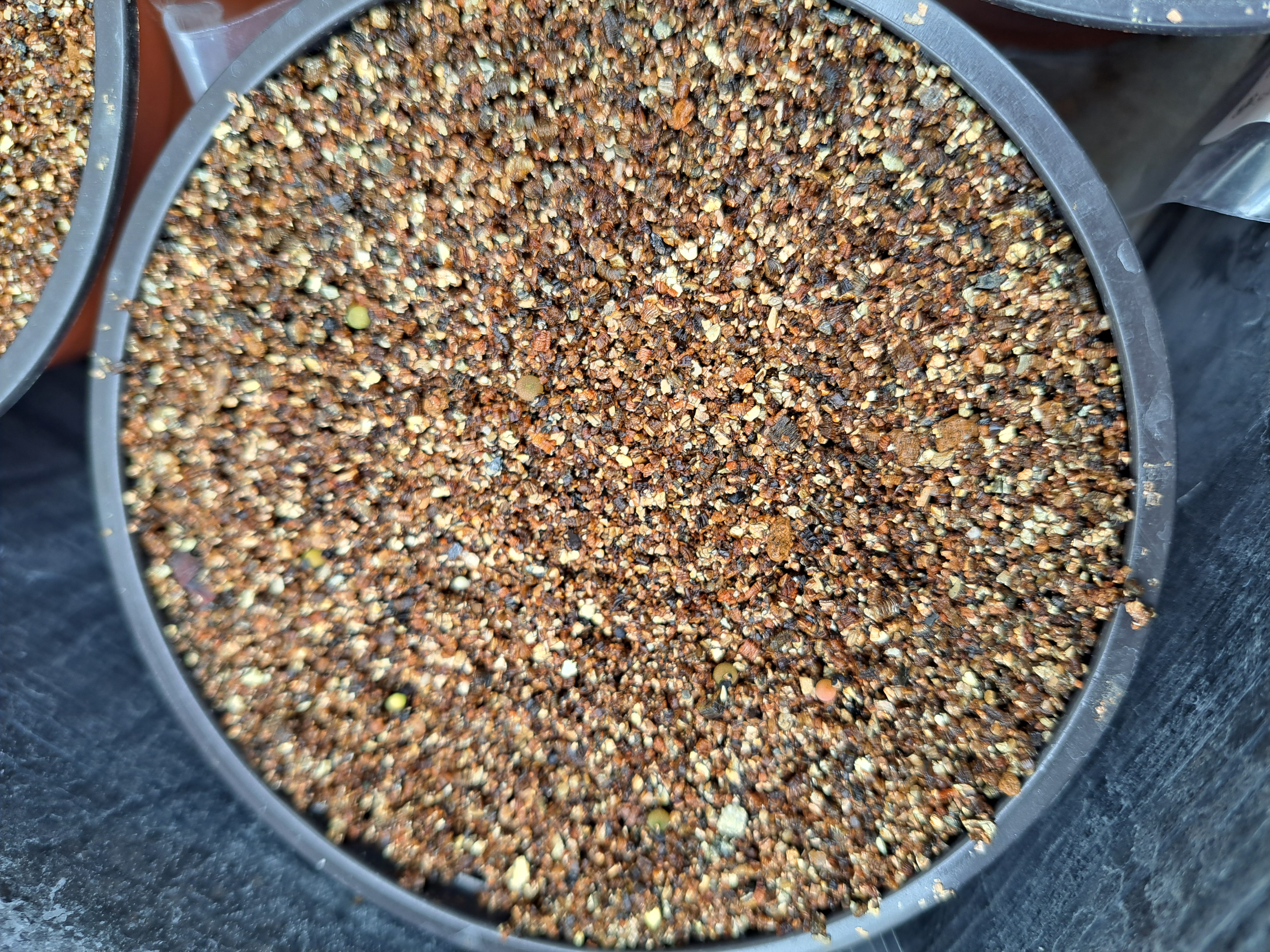 2024/10/12現在 二週間前に播種37粒/ 50粒発芽容器はザル付きタッパー 蓋に穴を開けたも...