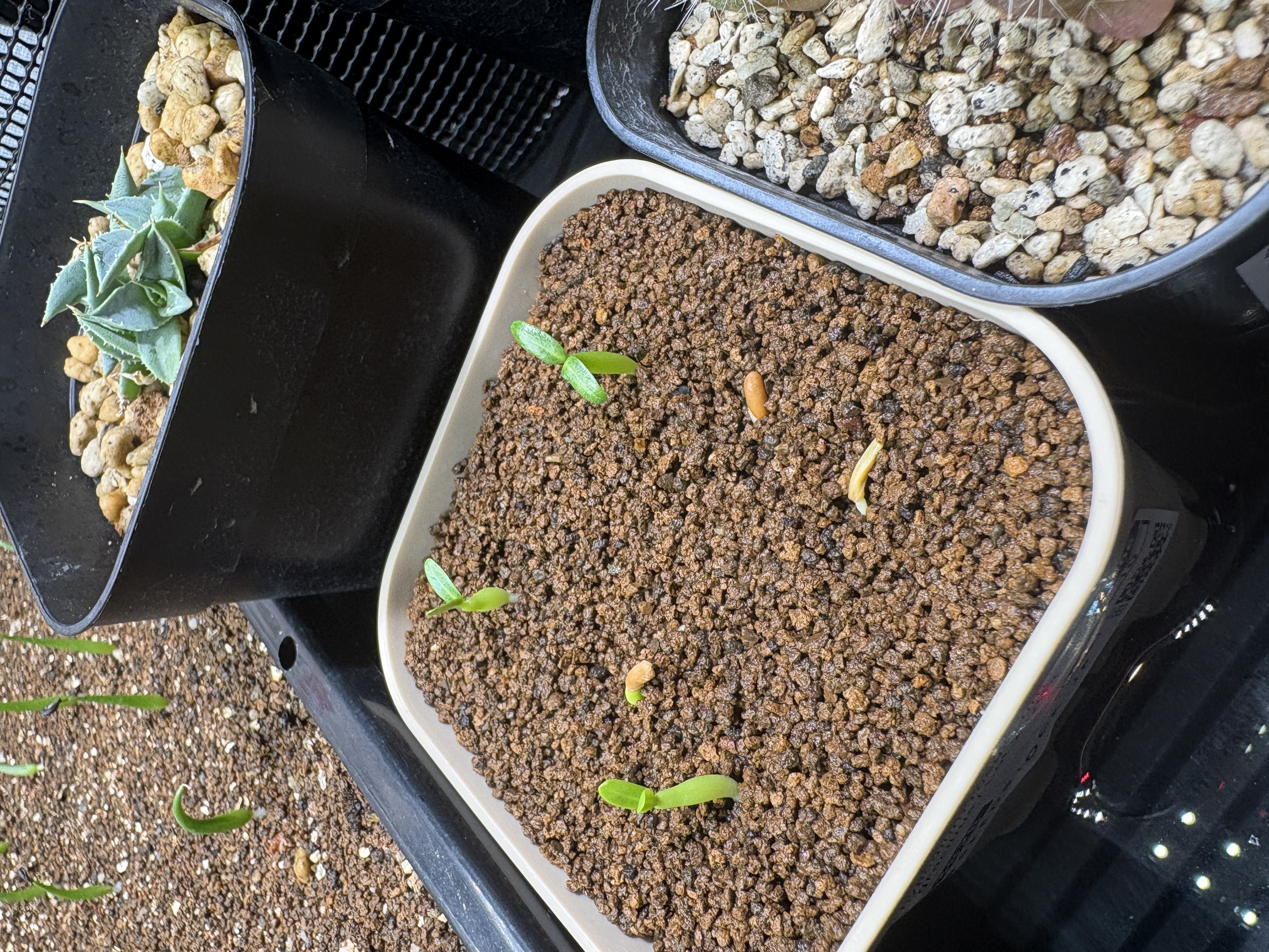 2025/9/18播種、2025/9/30撮影播種11粒/発芽 7粒、のち全部溶けました。1粒はカビ...