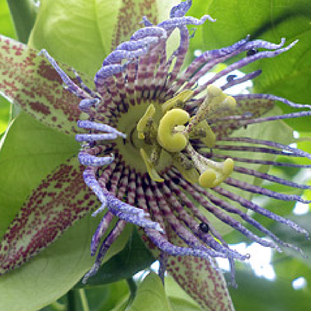 トケイソウ科パッションフルーツの一種ハート型の葉に美しい紫色の花を咲かせます。中央アメリカ、南アメリカ原産