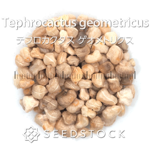 テフロカクタス ゲオメトリクスは、ウチワサボテン属(Opuntioideae)に属するサボテンで、 灰色から紫色を帯びた球状の茎節を形成します。茎節の直径は約4〜5cmで、 複数の球体が積み重なるように成長します。表面には3〜5mm程度の短い刺がまばらに生え、 球体に沿うような配列を示します。成長速度は非常に遅く、茎節が1〜2年に1節程度しか増えません。 成熟株では淡いピンク色から白色の花を咲かせます。