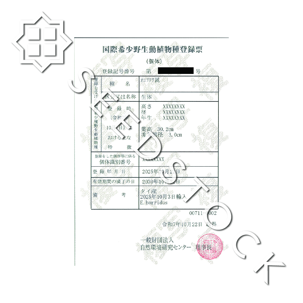 国際希少野生動植物種に該当し、登録票を同梱します。