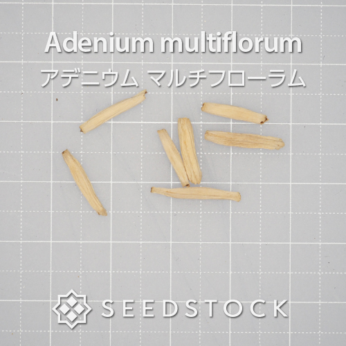アデニウム マルチフローラム(Adenium multiflorum)は、大きな人参のような根から枝分かれした茎が生じる多肉質の小さな木です。最大の高さは約3メートルで、樹皮や茎の肉質部分には有毒な乳白色の樹液が含まれています。樹皮は光沢のある灰色から茶色です。一年の大半は、この植物は葉や花をつけないことが多いです。葉は通常、花が咲いた後に現れます。葉は滑らかで、上面は光沢のある緑色、下面はそれよりも淡色で、先端に向かって幅広くなり、最大で長さは約12.5センチ、幅は約7.5センチになります。花はピンクから白で、喉部には赤いストライプがあり、深いピンクから緋色の縁のある5つの裂片を持っています。花の直径は最大で約7センチで、冬に花序の終端で咲きます。果実は淡灰色から淡灰褐色の対生する袋状果で、最大で長さは約18センチ、直径は約1.5センチになります。