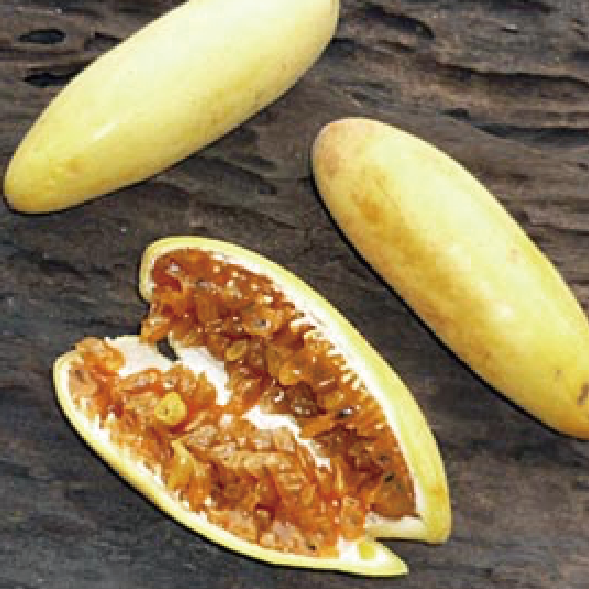 - 成長した株の特徴:優美な蔓性植物で、しなやかで力強い茎を伸ばします。葉は長さ12cm、幅15cmの三裂葉で、切れ込みが浅く、縁には細かい鋸歯が整然と並びます。葉の表面には短い毛が密生し、先端は尖った形状をしています。葉柄には4~6対の非対称な腺が見られます。そして何よりも目を奪われるのはその花です。最大8cmにもなる筒状の萼と、直径9~10cmの華やかな花冠は、美しいピンク色の鉤状の萼片と花弁で構成され、上品な雰囲気を醸し出しています。やや閉じ気味の花弁は、奥ゆかしさを漂わせます。紫色の小さな副花冠には、ピンク色のこぶがあり、さらに奥から長く伸びた白い雄蕊群が、濃い黄色の花粉をつけた葯を輝かせます。食用として知られる果実だけでなく、大きく華やかな花も観賞価値が高く、まさに宝石のような植物です。熟すと黄色くなる細長い果実(長さ10cm×直径3.5cm)をつけ、花は「バナナパッションフラワー(The Banana Passion Flower)」の愛称で親しまれ、商業的な栽培も盛んです。