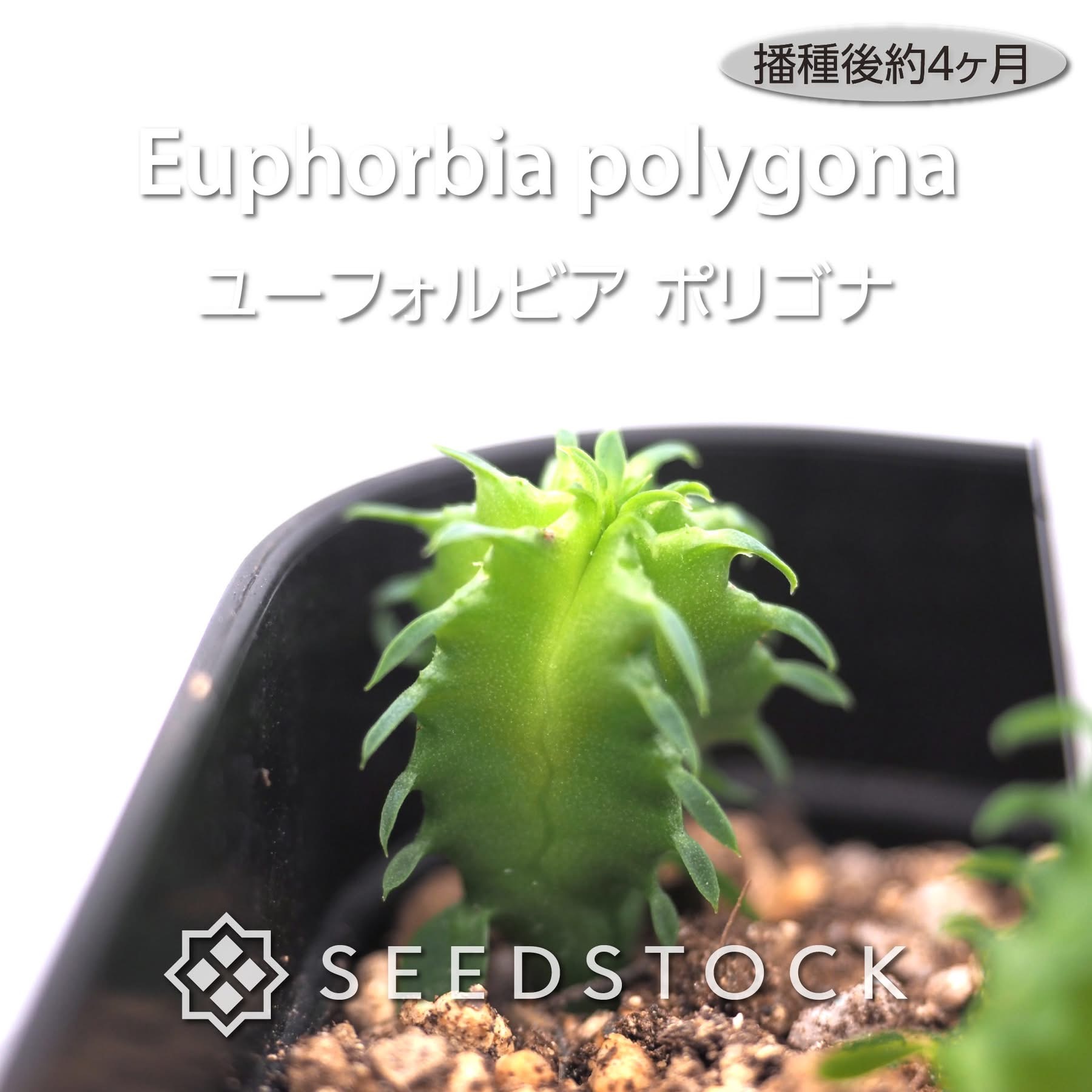 - 成長した株の特徴: ユーフォルビア ポリゴナは、全身に無数のトゲを持つ円柱状の多肉体を特徴とします。一般的には青白い緑色の外観を持ちますが、産地によっては白っぽい表皮を持つ個体も見られます。また、ユーフォルビア ホリダ(Euphorbia horrida)と非常によく似ていますが、花の色によって見分けることができます。杯状花序の腺体がホリダは緑色に対し、ポリゴナは黒紫色をしています。